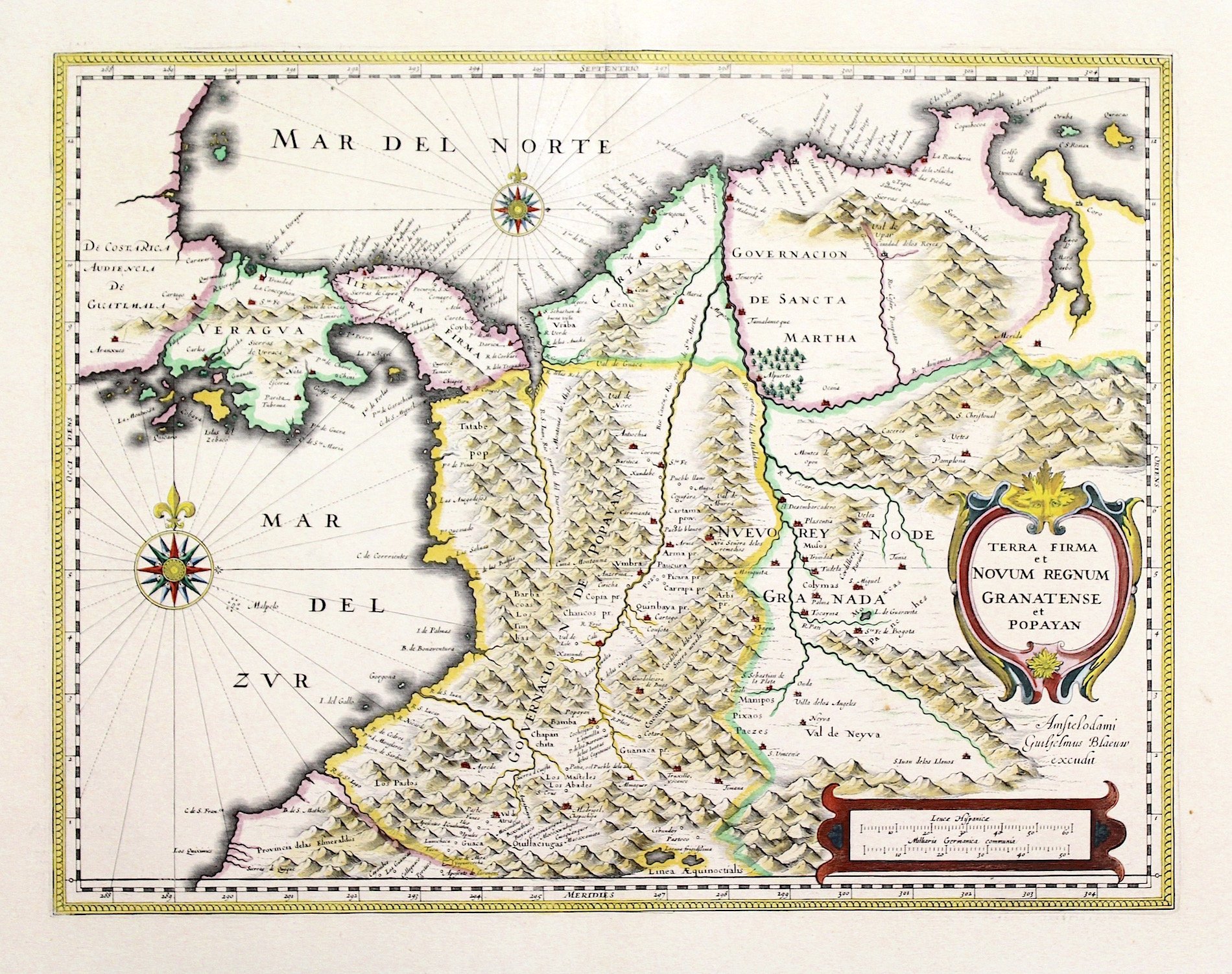 Incisione in rame, dipinta a mano, mm 380x495. Elegante e piacevole carta della Colombia. Ottimo esemplare perfettamente conservato. W. Blaeu, astronomo allievo di Tycho Brahe, fondò un'officina per la costruzione di globi nel 1599; quasi immediatamente iniziò a pubblicare anche carte geografiche, giungendo nel 1630 alla creazione del primo atlante "Atlantis Appendix" e cinque anni dopo, della prima edizione in due tomi del "Atlas Novus". Dopo la sua morte nel 1638, a cura del figlio Johan si giunse nel 1662 alla pubblicazione del celebre "Atlas Maior" in 11 volumi. Nel 1672 un incendio distrusse l'officina e segnò la fine dell'attività. € 500 <BR>Copper engraving, colored by hand, mm 380x495. Elegant and sought after map of Colombia. Very good condition. W. Blaeu, born in Alkmaar in 1571, studied astronomy by Tycho Brahe and founded a business in 1599 as a globe and instrument maker. He immediately expanded the business publishing maps and in 1630 the first atlas "Atlantis appendix" and five years later the "Atlas novus". After his death in 1638, his son Joan reached publication of the major work of the family, the "Atlas maior" in 11 volumes. in 1672 a great fire destroyed the Blaeu's printing house. <BR>