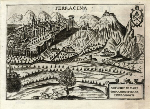 TERRACINA - "Terracina". Animata veduta prospettica della città e dei monti circostanti, con contadini al lavoro, cartiglio e stemma sulla destra: "Vetustiss ad mare Thirrhenum Terracinae oppidum".