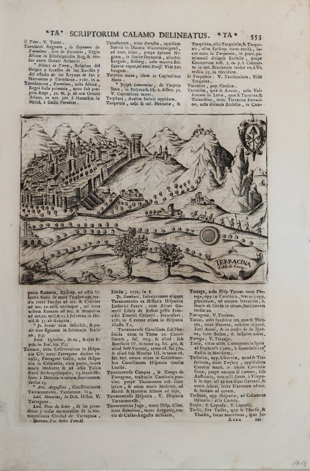 Veduta della città, edita per la prima volta nel 1599 nel "Theatrum Urbium Italicarum", serie di 59 tavole con vedute e piante accompagnate da descrizione latina, eseguite da più incisori, poi ristampata, accresciuta, anche con il titolo italiano Teatro delle città d’Italia, per i tipi di Domenico Amadio.Alla morte di Pietro , l’attività proseguì con suo figlio Francesco, anch’egli tipografo, incisore e editore. Il "Teatro delle città d’Italia" venne più volte ristampato e implementato da Francesco nel corso del secolosuccessivo. Questo esemplare è tratto dall'opera ' Universus terrarum orbis scriptorum calamo delineatus . qui de Europae, Asiae, Africae, & Americae regnis, provinciis, populis, civitatibus. pubblicata a Padova nel 1713, presso Matteo Cadorin, da Raffaello Savonarola, sotto lo pseudonimo di Lasor a Varea (o Varela). L'opera era una sorta di enciclopedia che conteneva notizie sulle varie località del mondo disposte in ordine alfabetico, arricchita da mappe e vedute di tutto il mondo che appartengono a celebri raccolte cartografiche del passato – Bertelli, Valegio, Camocio, Bonifacio, Nelli, Magini e altri – del quale probabilmente l’editore Cadorin era in possesso delle matrici originali. Incisione su rame, ampi margini, in ottimo stato di conservazione. This example is taken from the work ' Universus terrarum orbis scriptorum calamo delineatus . qui de Europae, Asiae, Africae, & Americae regnis, provinciis, populis, civitatibus. ' published in Padua in 1713, at Matteo Cadorin, by Raffaello Savonarola, under the pseudonym of Lasor a Varea (or Varela). The work was a kind of encyclopedia containing news about the various localities of the world arranged in alphabetical order, enriched with maps and views of the whole world belonging to famous cartographic collections of the past-Bertelli, Valegio, Camocio, Bonifacio, Nelli, Magini, and others-of which the publisher Cadorin probably possessed the original plates. Copper engraving, in excellent condition. Cfr.