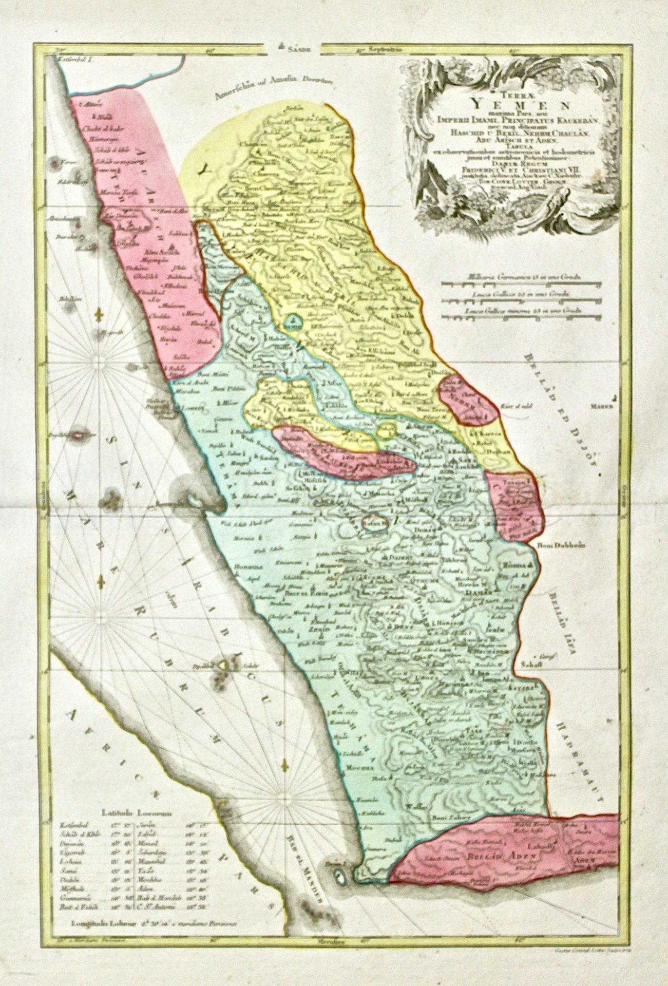Terrae Yemen maxima pars seu imperii Imami, principatus Kaukebân nec non ditionum Hashid u Bekîl, Nehhm, Chaulân, Abu Arîsh et Aden tabula.