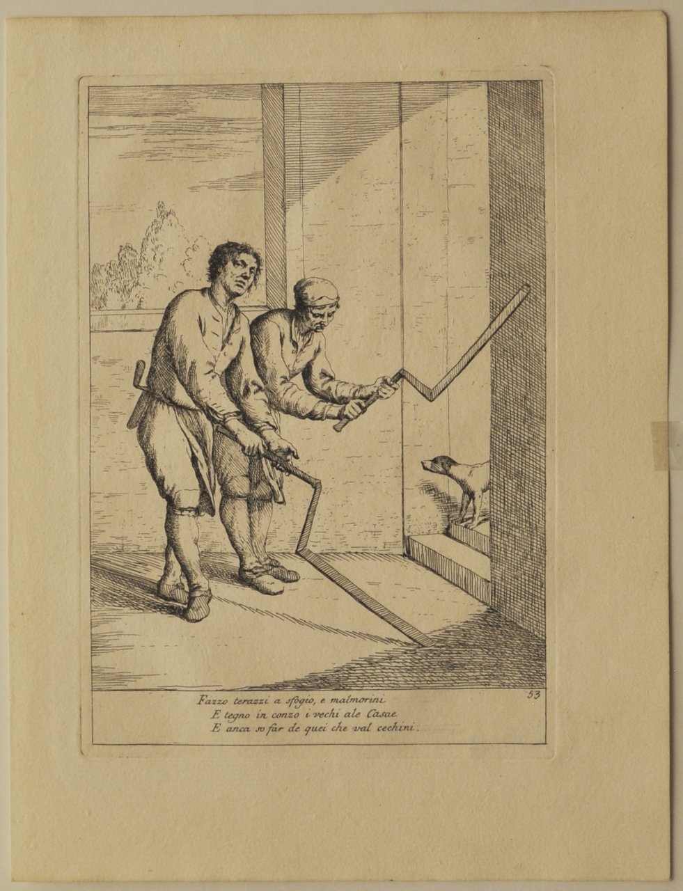 Acquaforte e bulino di mm 261 x 182. II/VI. Vergata veneziana tre lune, filigrana tre lune. Perfetta condizione."Fazzo terazzi a sfogio, e malmorini E tegno in conzo i vechi ale Casae E anca so far de quei che val cechini". A destra in basso numero 53. Proveniente da "Le Arti che vanno per via nella Città di Venezia inventate ed incise da Gaetano Zompini. Aggiuntavi una memoria di detto autore" Venezia 1785. Magnifica incisione in acquaforte e bulino della serie delle "Arti che van per via" di Zompini, stampata in una rarissima prima edizione coeva nel 1753, ed in questo secondo stato nel 1785 dal residente britannico John Strange. Venne ripubblicato in Inghilterra altre quattro volte. Da una lettera di John Strange si viene a sapere che la tiratura della presente edizione era di cento o duecento copie. Dario Succi "Da Carlevarijs a Tiepolo, Incisori veneti e friulani del settecento" pag. 454. "Gaetano Zompini nacque in Narvesa, nel Territorio Trivigiano, il 29 settembre 1698; ed inclinando da fanciullo alla Pittura, fu mandato a Venezia nella Scuola del Cavalier Bambini in que' tempi riputatissimo. Apprese dal suddetto oltre li principi del buon dissegno, anche in gran parte il suo modo di dipingere, ed uscito poi di detta Scuola si diede anche ad imitare la aniera di Sebastiano Ricci, allora dal medesimo introdotta ed assai stimata.Inventò pure e disegnò perilsig. Zattastampatore in Venezia buona parte delle Figure per le Edizioni del Dante e del Petrarca da lui stampata. Questo degno Pittore visse però quasi sempre povero, avendo numerosa Famiglia. Conoscendo per altro il di lui merito il fu Sig. Antonio Maria Zanetti, lo tirò appresso di sé, impiegandolo in vari lavori, ed in particolare in vari disegni, e lavorò in gran parte sopra alcuni rami tratti da' disegni di Gio. Benedetto Castiglione, posseduti dal detto Signore, e che avea già incominciato ad incidere; e per far la raccolta più numerosa, inventò, disegnò, ed incise egli stesso alcuni di detti Rami sul gusto affatto dell'Autore, e toccati con spirito. Non avendo poi esso Sig. Zanetti di che ordinargli di più, s'immaginarono di dare alle stampe una Raccolta delle Arti di Venezia, che vanno per via. Si accinse dunque lo Zompini al lavoro, ed inventò, disegnò, ed incise Rami num.60 rappresentanti l'Arti suddette, e sotto la direzione dello stesso sig. Zanetti, ed a imitazione poi delle Arti di Bologna similmente inventate ed incise dal celebre Annibale Carracci. A quest'opera fatta all'acqua forte, della quale alcune copie furono anche miniate, aggiunse sotto ogni rame alcuni versi il Dottor Questini Prete di Santa Maria Mater Domini, amico tanto dello Zompini, che del Zanetti. Pochi anni dopo mancò di vita il sig. Zanetti, il quale però per ilmerito dello Zompini, gli lasciò una picciola mensuale provigione sua vita durante. Dopo questa disgrazia ne successe allo Zompini un'altra peggiore, incominciandosi ad indebolire la vista; cosicchè alla fine la perdette affatto, e strascinandosi in tal modo fra le miserie e la vecchiaia, mancò di vivere il 20 Maggio 1778 nell'avanzata età di 76 anni."