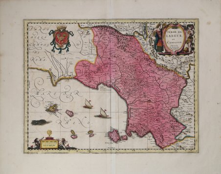 Elegante carta eseguita sul modello di Magini. Willem Janszoon Blaeu, avviò nel 1599 la sua attività di costruttore di globi e strumenti astronomici ad Amsterdam. Nel 1630, dopo aver comprato alcune lastre dell’atlante del Mercator da Jodocus Hondius II, fu in grado di pubblicare un volume di 60 mappe con il titolo di ' Atlantis Appendix. Cinque anni dopo, pubblicò i primi due volumi del suo atlante ' Atlas Novus ' o ' Theatrum Orbis Terrarum, ' in sei libri. Dopo la sua morte, Joan (Johannes) continuò l’opera paterna, completando l’intera serie di sei volume dell’Atlas Novus ' intorno al 1655. Fu inoltre autore di un ' Atlas Maior sive Cosmographia Blaviana, in 12 volumi pubblicati nel 1662 -72, dei quali uno dedicato all'Italia. La carta compare per la prima volta nel terzo volume del ' Theatrum. ' Secondo Koeman viene pubblicata in primis nell'edizione francese del 1640, dal titolo ' Le Theatre du Monde ou Nouvel Atlas, ' Mis en lumiere par Guillaume & Jean Blaeu. ' Troisieme partie. A Amsterdam, Chez Iean & Corneille Blaeu MDCXL. Il terzo volume del ' Theatrum ' contiene 58 carte dell'Italia e 4 della Grecia (cfr. Koeman, ' Atlas Neerlandici, pp. 160-162, Bl 35A). Le carte dell'italia derivano tutte dall'opera di Giovanni Antonio Magini. Tuttavia, sembra più probabile che il Blaeu si basi sue quelle di Hendrick Hondius e Johannes Janssonius pubblicate nel ' Theatrum Italiae in quo Eius Regna, Domina, Ducatus, Et Speciatim Illorum Provinciae, Tabulis Accuratissimis, Iam, De Novo in Lucem Editio, Describunter, Quorum Sequens Pagina Indicabit, stampato ad Amsterdam da Hendrick Hondius nel 1636. ' Sebbene pubblicate dopo la morte di Willem Janszoon Blaeu (1638) le carte spesso recano il suo imprint. Non è dato sapere se fossero tutte già pronte o se i figli Johannes e Cornelis le compilarono postume. Carta tratta dal Nouveau Theatre de l'Italie di Pierre Mortier, Amsterdam 1704. ' Incisione in rame, magnifica coloritura coeva con rialzi in oro zecchino, in ottimo stato di conservazione. The map first appears in the third volume of the Theatrum. According to Koeman it is first published in the French edition of 1640, entitled Le Theatre du Monde ou Nouvel Atlas, Mis en lumiere par Guillaume & Jean Blaeu. Troisieme partie. In Amsterdam, Chez Iean & Corneille Blaeu MDCXL. The third volume of the Theatrum contains 58 maps of Italy and 4 of Greece (see Koeman, Atlas Neerlandici, pp. 160-162, Bl 35A). The maps of Italy are all derived from the work of Giovanni Antonio Magini. However, it seems more likely that Blaeu relies on those of Hendrick Hondius and Johannes Janssonius published in Theatrum Italiae in quo Eius Regna, Domina, Ducatus, Et Speciatim Illorum Provinciae, Tabulis Accuratissimis, Iam, De Novo in Lucem Editio, Describunter, Quorum Sequens Pagina Indicabit, printed in Amsterdam by Hendrick Hondius in 1636. Although published after the death of Willem Janszoon Blaeu (1638) the maps often bear his imprint. It is not known whether they were all ready-made or if his sons Johannes and Cornelis completed them posthumously. Willem Janszoon Blaeu, started in 1599 his business as a builder of globes and astronomical instruments in Amsterdam. In 1630, after buying some plates of the Mercator atlas from Jodocus Hondius II, he was able to publish a volume of 60 maps under the title ' Atlantis Appendix. Five years later, he published the first two volumes of his atlas ' Atlas Novus ' or ' Theatrum Orbis Terrarum, in six books. After his death, Joan (Johannes) continued his father's work, completing the entire six-volume ' Atlas Novus ' series around 1655. He was also the author of an ' Atlas Maior sive Cosmographia Blaviana, in 12 volumes published in 1662 -72. Late issue by Pierre Mortier, 1704. Incisione in rame, magnifica coloritura coeva con rialzi in oro zecchino, in ottimo stato di conservazione. Cfr.