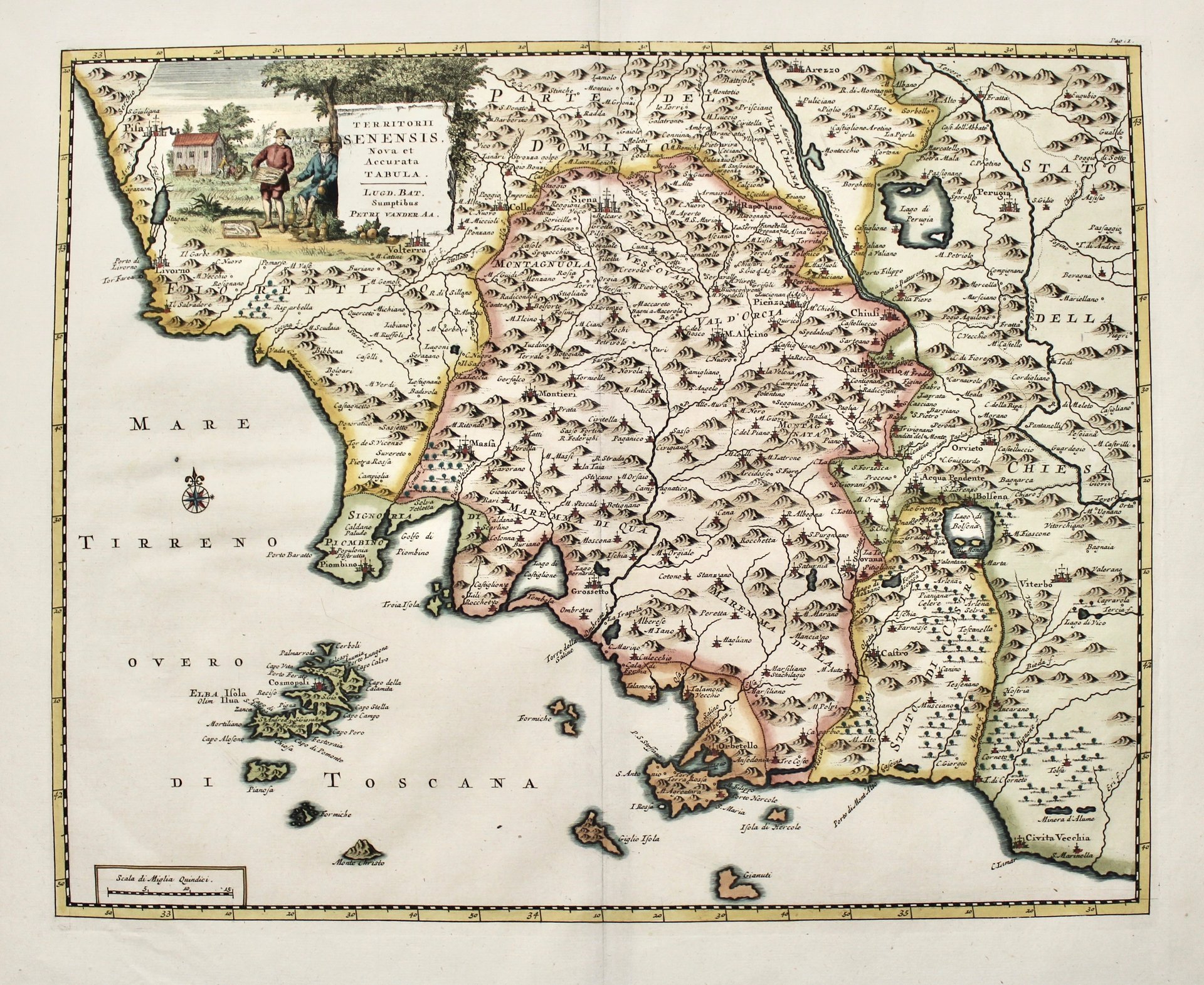 Incisione in rame dipinta a mano, mm300x377. Carta geogr. del territorio. Ottimo esemplare con usuali pieghe editoriali. Estratto da: GRAEVIUS JOANNES GEORGIUS. Thesaurus antiquitatum et historiarum Italiae. Peter van der Aa (1659 - Leida 1733) editore olandese, fu particolarmente noto per l'elaborazione di mappe e atlanti. <BR>