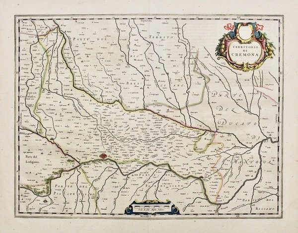 Incisione in rame, colorata d'epoca, mm 377x497. Elegante carta eseguita sul modello di Magini. Ottimo esemplare. W. Blaeu, astronomo allievo di Tycho Brahe, fondò un'officina per la costruzione di globi nel 1599; quasi immediatamente iniziò a pubblicare anche carte geografiche, giungendo nel 1630 alla creazione del primo atlante "Atlantis Appendix" e cinque anni dopo, della prima edizione in due tomi del "Atlas Novus". Dopo la sua morte nel 1638, a cura del figlio Johan si giunse nel 1662 alla pubblicazione del celebre "Atlas Maior" in 11 volumi. Nel 1672 un incendio distrusse l'officina e segnò la fine dell'attività.