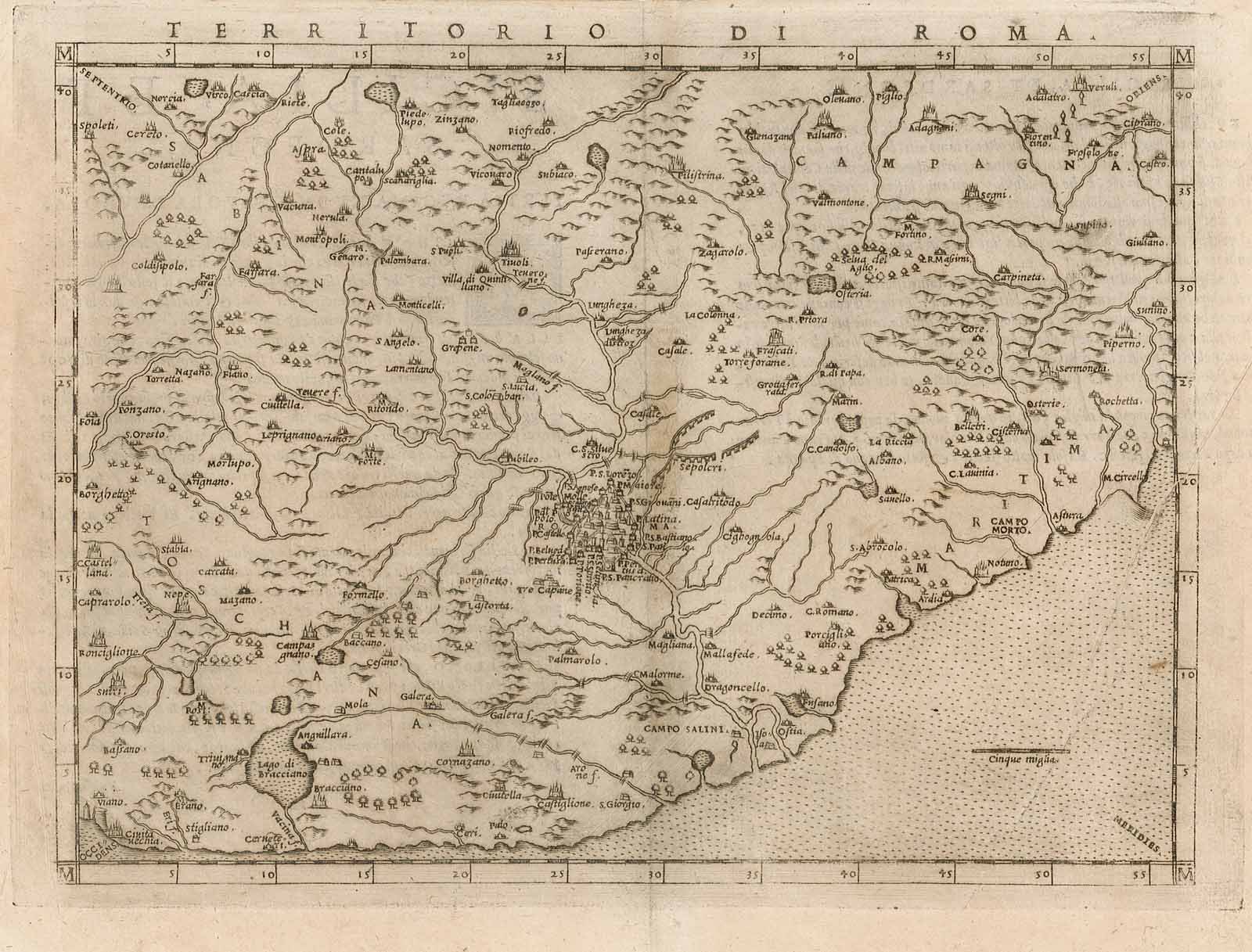 Carta del territorio laziale dei dintorni di Roma. Inserita nell'opera "La Geografia di Claudio Tolomeo alessandrino, già tradotta di greco in italiano da M. Giero. Ruscelli: & hora in questa nuoua editione da M. Gio. Malombra ricorretta, & purgata d'infiniti errori: . Con l'Espositioni del Ruscelli, . Con una copiosa tauola de' nomi antichi, dichiarati co' nomi moderni: dal Malombra riueduta, & ampliata. Et con un Discorso di M. Gioseppe Moleto, . "