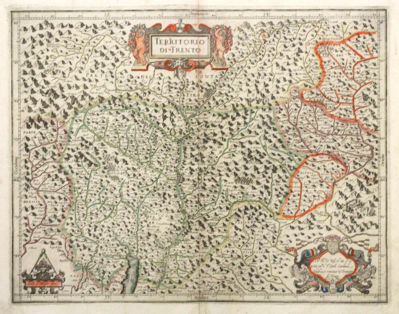 Incisione in rame, mm 360x460, colorata d'epoca. Fascinosa carta del territorio, tratta da "Italia" il fondamentale primo atlante con carte di tutta la penisola, che il geografo e matematico Magini realizzò a fine '500, ma che, a causa della sua morte, fu pubblicato solo nel 1620 dal figlio. Grazie ai contatti personali con le istituzioni ed i più importanti cartografi del tempo, Magini ebbe a disposizione materiale cartografico talvolta inedito o comunque non disponibile per gli studiosi. La sua opera costituì il fondamento di tutta la cartografia del XVII secolo, venendo costantemente copiata da tutti i successivi autori. Titolo in alto al centro, cartiglio in basso a sinistra con la dedica al Cardinale Madruzzo. Ottimo esemplare