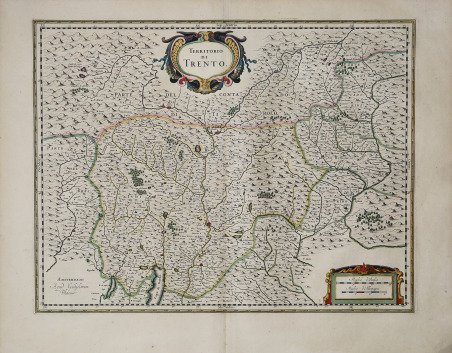 Carta geografica inserita nell'Atlas Major ' del Blaeu.Dal punto di vista cartografico la mappa deriva dalla carta del Magini già ripresa in Olanda da Jodocus Hondius. Willem Janszoon Blaeu, avviò nel 1599 la sua attività di costruttore di globi e strumenti astronomici ad Amsterdam. Nel 1630, dopo aver comprato alcune lastre dell’atlante del Mercator da Jodocus Hondius II, fu in grado di pubblicare un volume di 60 mappe con il titolo di ' Atlantis Appendix. Cinque anni dopo, pubblicò i primi due volumi del suo atlante ' Atlas Novus ' o ' Theatrum Orbis Terrarum, ' in sei libri. Dopo la sua morte, Joan (Johannes) continuò l’opera paterna, completando l’intera serie di sei volume dell’Atlas Novus ' intorno al 1655. Fu inoltre autore di un ' Atlas Maior sive Cosmographia Blaviana, in 12 volumi pubblicati nel 1662 -72, dei quali uno dedicato all'Italia. La carta compare per la prima volta nel terzo volume del ' Theatrum. ' Secondo Koeman viene pubblicata in primis nell'edizione francese del 1640, dal titolo ' Le Theatre du Monde ou Nouvel Atlas, ' Mis en lumiere par Guillaume & Jean Blaeu. ' Troisieme partie. A Amsterdam, Chez Iean & Corneille Blaeu MDCXL. Il terzo volume del ' Theatrum ' contiene 58 carte dell'Italia e 4 della Grecia (cfr. Koeman, ' Atlas Neerlandici, pp. 160-162, Bl 35A). Le carte dell'italia derivano tutte dall'opera di Giovanni Antonio Magini. Tuttavia, sembra più probabile che il Blaeu si basi sue quelle di Hendrick Hondius e Johannes Janssonius pubblicate nel ' Theatrum Italiae in quo Eius Regna, Domina, Ducatus, Et Speciatim Illorum Provinciae, Tabulis Accuratissimis, Iam, De Novo in Lucem Editio, Describunter, Quorum Sequens Pagina Indicabit, stampato ad Amsterdam da Hendrick Hondius nel 1636. ' Sebbene pubblicate dopo la morte di Willem Janszoon Blaeu (1638) le carte spesso recano il suo imprint. Non è dato sapere se fossero tutte già pronte o se i figli Johannes e Cornelis le compilarono postume. Incisione in rame, magnifica coloritura coeva, in ottimo stato di conservazione. Striking example of Blaeu's decorative map of Trentino after Giovanni Antonio Magini. Willem Janszoon Blaeu, started in 1599 his business as a builder of globes and astronomical instruments in Amsterdam. In 1630, after buying some plates of the Mercator atlas from Jodocus Hondius II, he was able to publish a volume of 60 maps under the title ' Atlantis Appendix. Five years later, he published the first two volumes of his atlas ' Atlas Novus ' or ' Theatrum Orbis Terrarum, in six books. After his death, Joan (Johannes) continued his father's work, completing the entire six-volume ' Atlas Novus ' series around 1655. He was also the author of an ' Atlas Maior sive Cosmographia Blaviana, in 12 volumes published in 1662 -72, one of which was devoted to Italy. The map first appears in the third volume of the ' Theatrum. According to Koeman it is first published in the French edition of 1640, entitled ' Le Theatre du Monde ou Nouvel Atlas, Mis en lumiere par Guillaume & Jean Blaeu. Troisieme partie. In Amsterdam, Chez Iean & Corneille Blaeu MDCXL. The third volume of the ' Theatrum ' contains 58 maps of Italy and 4 of Greece (see Koeman, ' Atlas Neerlandici, pp. 160-162, Bl 35A). The maps of Italy are all derived from the work of Giovanni Antonio Magini. However, it seems more likely that Blaeu relies on those of Hendrick Hondius and Johannes Janssonius published in ' Theatrum Italiae in quo Eius Regna, Domina, Ducatus, Et Speciatim Illorum Provinciae, Tabulis Accuratissimis, Iam, De Novo in Lucem Editio, Describunter, Quorum Sequens Pagina Indicabit, ' printed in Amsterdam by Hendrick Hondius in 1636. Although published after the death of Willem Janszoon Blaeu (1638) the maps often bear his imprint. It is not known whether they were all ready-made or if his sons Johannes and Cornelis completed them posthumously. Copperplate, with fine original colouring, in very good conditions. Cfr.