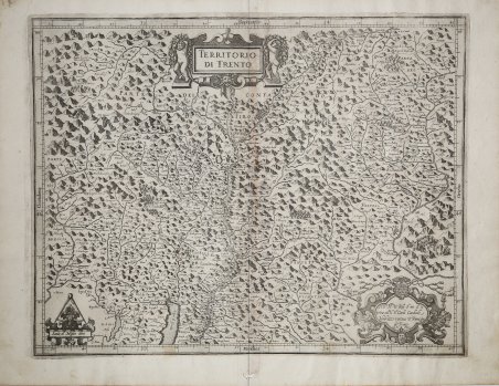 Carta geografica tratta dal ' L’Italia ' a cura di Fabio Magini, edito a Bologna nel 1620, tre anni dopo la prematura morte del padre. Composto da un breve testo descrittivo di sole 24 carte, l’opera è corredata di 61 carte geografiche della penisola, e costituisce il primo esempio di atlante italiano. L’opera è per intero di mano del Magini, che iniziò la realizzazione delle carte nel 1594 circa, dando alla luce per prima nel 1595 la carta del territorio di Bologna. Tutte le carte vennero alle stampe quindi prima del 1620, nelle loro stesure provvisorie, successivamente corrette ed aggiornate per l’edizione definitiva. Per la realizzazione delle lastre il Magini si servì di due dei più famosi intagliatori dell’epoca: il belga Arnoldo Arnoldi e l’inglese Benjamin Wright. Nel cartiglio in alto al centro il titolo TERRITORIO DI TRENTO. In basso, nel cartiglio a destra la dedica ' All’ Ill.mo & Rev.mo Sor ' mio S.re & p[ad]rone col.mo il S.or Carlo Cardinale Madruzzi vescovo & Prencipe di Trento. Gio. Ant. Magini. sotto il cartiglio la firma Ben. W. f. ( Benjamin Wright fecit). A sinistra la scala grafica Scala di Miglia dieci (10 miglia pari a mm 43). Orientazione nei quattro lati al centro con il nome dei punti cardinali Septentrio, Meridies, Oriens, Occidens, il nord in alto. Graduazione ai margini di 1’ in 1’ da 45° 30’ a 46° 40’ 40’’ di latitudine, e da 32° 26’ 30’’ a 34° 40’ 20’’ di longitudine. Iniziata da Arnoldo Arnoldi, la lastra venne probabilmente terminata dal Wright intorno al 1607. Bibliografia Tomasi (1997): pp. 50-55, n. 24. Map taken from ' L'Italia ' edited by Fabio Magini, published in Bologna in 1620, three years after the untimely death of his father. Composed of a short descriptive text of only 24 pages, the work is accompanied by 61 maps of the peninsula, and is the first example of an Italian atlas. The work is entirely by the hand of Giovanni Antonio Magini, who began the realization of the maps in 1594 or so; the first dated map (1595) the map of the territory of Bologna. All the maps were printed before 1620, in their provisional drafts, later corrected and updated for the final edition. For the realization of the plates Magini used two of the most famous engravers of the time: the Belgian Arnoldo Arnoldi and the English Benjamin Wright. Copperplate, in good condition. Nel cartiglio in alto al centro il titolo ' TERRITORIO DI TRENTO. ' In basso, nel cartiglio a destra la dedica ' All’ Ill.mo ' & Rev.mo ' Sor ' mio S.re ' & p[ad]rone col.mo ' il S.or ' Carlo Cardinale Madruzzi vescovo & Prencipe di Trento. Gio. Ant. Magini. ' sotto il cartiglio la firma ' Ben. W. f. ' ( Benjamin Wright fecit). A sinistra la scala grafica ' Scala di Miglia dieci ' (10 miglia pari a mm 43). Orientazione nei quattro lati al centro con il nome dei punti cardinali ' Septentrio, Meridies, Oriens, Occidens, ' il nord in alto. Graduazione ai margini di 1’ in 1’ da 45° 30’ a 46° 40’ 40’’ di latitudine, e da 32° 26’ 30’’ a 34° 40’ 20’’ di longitudine. Iniziata da Arnoldo Arnoldi, la lastra venne probabilmente terminata dal Wright intorno al 1607. Bibliografia Tomasi (1997): pp. 50-55, n. 24. Cfr.