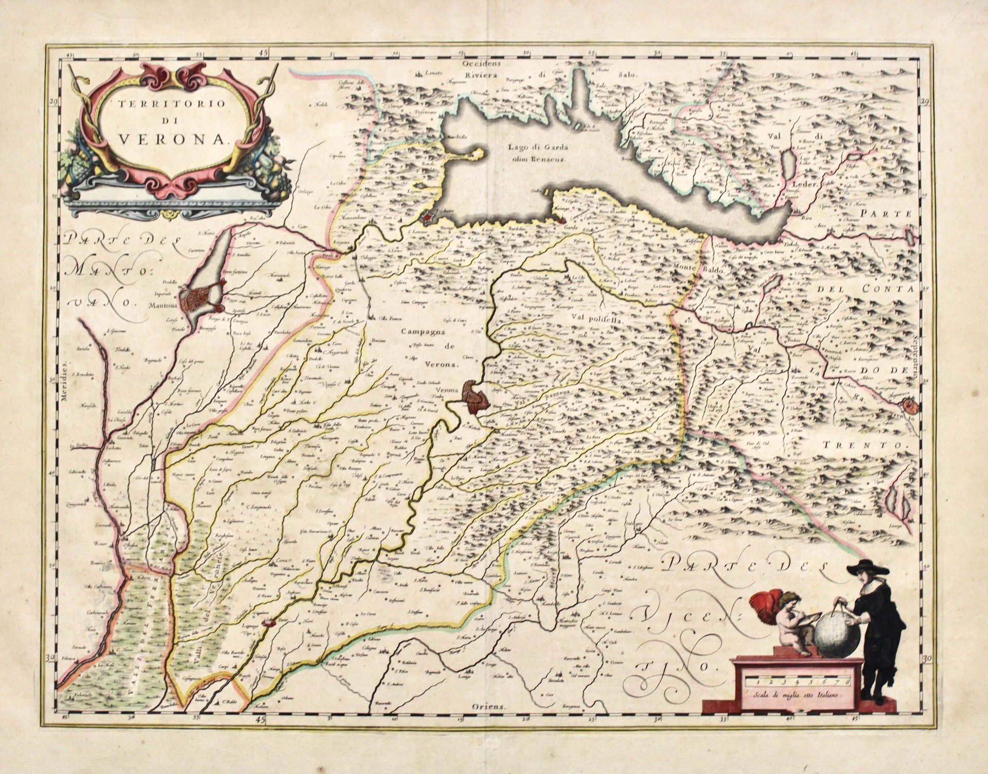 Incisione in rame, colorata d'epoca, mm 385x495. Elegante carta eseguita sul modello di Magini. Ottimo esemplare con carta leggermente ingiallita. W. Blaeu, astronomo allievo di Tycho Brahe, fondò un'officina per la costruzione di globi nel 1599; quasi immediatamente iniziò a pubblicare anche carte geografiche, giungendo nel 1630 alla creazione del primo atlante "Atlantis Appendix" e cinque anni dopo, della prima edizione in due tomi del "Atlas Novus". Dopo la sua morte nel 1638, a cura del figlio Johan si giunse nel 1662 alla pubblicazione del celebre "Atlas Maior" in 11 volumi. Nel 1672 un incendio distrusse l'officina e segnò la fine dell'attività. Copper engraving, original colour, 385x495. Elegant map from the original by Magini. A very good example. W. Blaeu, born in Alkmaar in 1571, studied astronomy by Tycho Brahe and founded a business in 1599 as a globe and instrument maker. He immediately expanded the business publishing maps and in 1630 the first atlas "Atlantis appendix" and five years later the "Atlas novus". After his death in 1638, his son Joan reached publication of the major work of the family, the "Atlas maior" in 11 volumes. in 1672 a great fire destroyed the Blaeu's printing house.