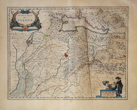 Elegante carta eseguita sul modello di Magini. Willem Janszoon Blaeu, avviò nel 1599 la sua attività di costruttore di globi e strumenti astronomici ad Amsterdam. Nel 1630, dopo aver comprato alcune lastre dell’atlante del Mercator da Jodocus Hondius II, fu in grado di pubblicare un volume di 60 mappe con il titolo di ' Atlantis Appendix. Cinque anni dopo, pubblicò i primi due volumi del suo atlante ' Atlas Novus ' o ' Theatrum Orbis Terrarum, ' in sei libri. Dopo la sua morte, Joan (Johannes) continuò l’opera paterna, completando l’intera serie di sei volume dell’Atlas Novus ' intorno al 1655. Fu inoltre autore di un ' Atlas Maior sive Cosmographia Blaviana, in 12 volumi pubblicati nel 1662 -72, dei quali uno dedicato all'Italia. La carta compare per la prima volta nel terzo volume del ' Theatrum. ' Secondo Koeman viene pubblicata in primis nell'edizione francese del 1640, dal titolo ' Le Theatre du Monde ou Nouvel Atlas, ' Mis en lumiere par Guillaume & Jean Blaeu. ' Troisieme partie. A Amsterdam, Chez Iean & Corneille Blaeu MDCXL. Il terzo volume del ' Theatrum ' contiene 58 carte dell'Italia e 4 della Grecia (cfr. Koeman, ' Atlas Neerlandici, pp. 160-162, Bl 35A). Le carte dell'italia derivano tutte dall'opera di Giovanni Antonio Magini. Tuttavia, sembra più probabile che il Blaeu si basi sue quelle di Hendrick Hondius e Johannes Janssonius pubblicate nel ' Theatrum Italiae in quo Eius Regna, Domina, Ducatus, Et Speciatim Illorum Provinciae, Tabulis Accuratissimis, Iam, De Novo in Lucem Editio, Describunter, Quorum Sequens Pagina Indicabit, stampato ad Amsterdam da Hendrick Hondius nel 1636. ' Sebbene pubblicate dopo la morte di Willem Janszoon Blaeu (1638) le carte spesso recano il suo imprint. Non è dato sapere se fossero tutte già pronte o se i figli Johannes e Cornelis le compilarono postume. Incisione in rame, coloritura coeva, in buono stato di conservazione. Finely colored example of Blaeu's map of the Verona region. Willem Janszoon Blaeu, started in 1599 his business as a builder of globes and astronomical instruments in Amsterdam. In 1630, after buying some plates of the Mercator atlas from Jodocus Hondius II, he was able to publish a volume of 60 maps under the title ' Atlantis Appendix. Five years later, he published the first two volumes of his atlas ' Atlas Novus ' or ' Theatrum Orbis Terrarum, in six books. After his death, Joan (Johannes) continued his father's work, completing the entire six-volume ' Atlas Novus ' series around 1655. He was also the author of an ' Atlas Maior sive Cosmographia Blaviana, in 12 volumes published in 1662 -72, one of which was devoted to Italy. The map first appears in the third volume of the ' Theatrum. According to Koeman it is first published in the French edition of 1640, entitled ' Le Theatre du Monde ou Nouvel Atlas, Mis en lumiere par Guillaume & Jean Blaeu. Troisieme partie. In Amsterdam, Chez Iean & Corneille Blaeu MDCXL. The third volume of the ' Theatrum ' contains 58 maps of Italy and 4 of Greece (see Koeman, ' Atlas Neerlandici, pp. 160-162, Bl 35A). The maps of Italy are all derived from the work of Giovanni Antonio Magini. However, it seems more likely that Blaeu relies on those of Hendrick Hondius and Johannes Janssonius published in ' Theatrum Italiae in quo Eius Regna, Domina, Ducatus, Et Speciatim Illorum Provinciae, Tabulis Accuratissimis, Iam, De Novo in Lucem Editio, Describunter, Quorum Sequens Pagina Indicabit, ' printed in Amsterdam by Hendrick Hondius in 1636. Although published after the death of Willem Janszoon Blaeu (1638) the maps often bear his imprint. It is not known whether they were all ready-made or if his sons Johannes and Cornelis completed them posthumously. Includes a decorative cartouche. Cfr.