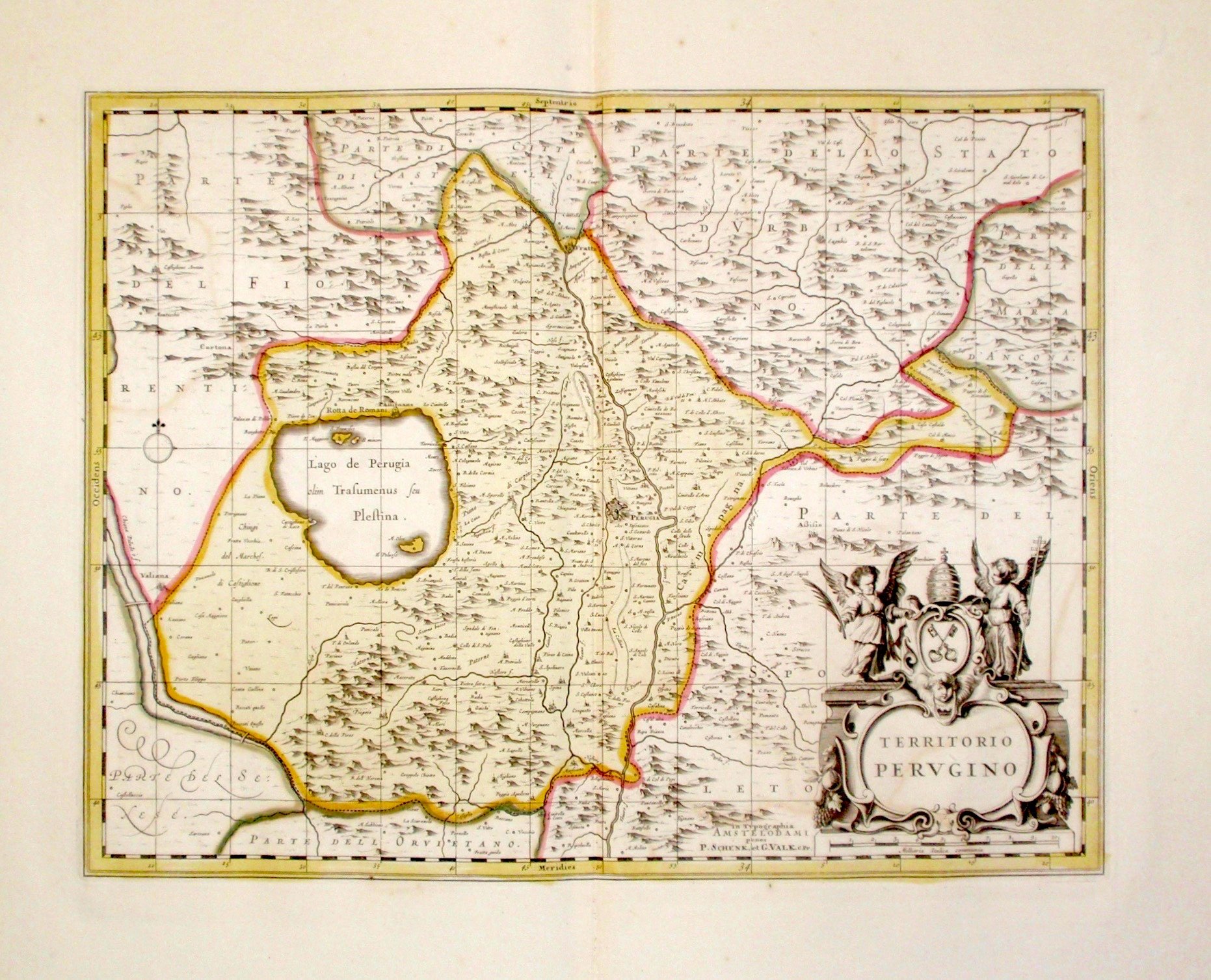 Incisione in rame, coloritura originale d'epoca, mm 375x485. Non comune e decorativa carta, bel cartiglio figurato in basso a destra, raffigurante il territorio di Perugia. Schenk e Valk fondarono una società editoriale che pubblicò lastre acquistate da editori precedenti. Ottimo esemplare marginoso. Lievissima stampa in controparte dei colori.