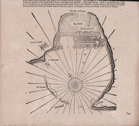 Piano nautico raffigurante il porto di Taranto tratta dall'edizione inglese del "De Nieuwe Groote Lichtende Zee-Fakkel", ovvero un portolano dei mari del mondo pubblicato tra il 1681 e il 1684 in cinque volumi in folio, ai quali - nel 1753 - se ne aggiunse un sesto per la navigazione lungo le coste asiatiche. Xilografia, in ottimo stato di conservazione. Piano nautico raffigurante il porto di Taranto tratta dall'edizione inglese del "De Nieuwe Groote Lichtende Zee-Fakkel", ovvero un portolano dei mari del mondo pubblicato tra il 1681 e il 1684 in cinque volumi in folio, ai quali - nel 1753 - se ne aggiunse un sesto per la navigazione lungo le coste asiatiche. Xilografia, in ottimo stato di conservazione. Cfr.