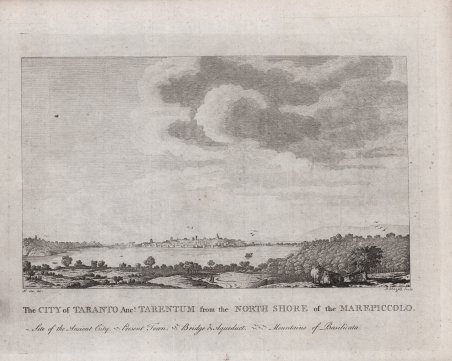 Carta geografica del porto e della città di Taranto pubblicata nel libro di Henry Swinburne, Travels in the Two Sicilies . in the years 1777, 1778, 1779, and 1780. The second edition. [With plates after designs by the author, and a map.] stampato a Londra nel 1790. Henry Swinburne, nato a Bristol da nobile famiglia cattolica nel 1743 passò da giovane in Francia dove studiò in diverse città. A causa della morte prematura del fratello maggiore ereditò ben presto la fortuna paterna e si stabilì definitivamente in Francia, nazione che elesse a sua seconda patria. A 24 anni si sposò con una sua connazionale Marta Barken, che condivideva con lui gli interessi per i viaggi, le belle arti, la pittura e l’archeologia. Stancatisi della loro vita di provincia, i coniugi Swinburne cominciarono a viaggiare avendo come prima meta territorio francese e poi la vicina Spagna.Ben presto tuttavia passarono in Italia, ivi attratti dalle notizie sulle bellezze artistiche e di costume. Fu così che si fermarono per circa tre anni, dal 1777 al 1779, nel Regno di Napoli che visitarono in lungo ed in largo, apprendendo usanze, costumi e modi di vita delle genti del profondo Sud. Lo Swinburne dedicò poi a questo lungo viaggio un libro dal titolo ‘Travels in the two Sicilies”, apparso alcuni anni dopo il ritorno in patria (1783). I due volumi sulle Due Sicilie, stampati e pubblicati a Londra, ebbero subito un grande successo sulla scia del libro del Brydone di alcuni anni prima, che aveva aperto, potremmo dire, la moda del viaggio al sud tra i molti ed annoiati aristocratici europei. Acquaforte, in buono stato di conservazione. Carta geografica del porto e della città di Taranto pubblicata nel libro di Henry Swinburne, Travels in the Two Sicilies . in the years 1777, 1778, 1779, and 1780. The second edition. [With plates after designs by the author, and a map.] stampato a Londra nel 1790. Henry Swinburne, nato a Bristol da nobile famiglia cattolica nel 1743 passò da giovane in Francia dove studiò in diverse città. A causa della morte prematura del fratello maggiore ereditò ben presto la fortuna paterna e si stabilì definitivamente in Francia, nazione che elesse a sua seconda patria. A 24 anni si sposò con una sua connazionale Marta Barken, che condivideva con lui gli interessi per i viaggi, le belle arti, la pittura e l’archeologia. Stancatisi della loro vita di provincia, i coniugi Swinburne cominciarono a viaggiare avendo come prima meta territorio francese e poi la vicina Spagna.Ben presto tuttavia passarono in Italia, ivi attratti dalle notizie sulle bellezze artistiche e di costume. Fu così che si fermarono per circa tre anni, dal 1777 al 1779, nel Regno di Napoli che visitarono in lungo ed in largo, apprendendo usanze, costumi e modi di vita delle genti del profondo Sud. Lo Swinburne dedicò poi a questo lungo viaggio un libro dal titolo ‘Travels in the two Sicilies”, apparso alcuni anni dopo il ritorno in patria (1783). I due volumi sulle Due Sicilie, stampati e pubblicati a Londra, ebbero subito un grande successo sulla scia del libro del Brydone di alcuni anni prima, che aveva aperto, potremmo dire, la moda del viaggio al sud tra i molti ed annoiati aristocratici europei. Acquaforte, in buono stato di conservazione. Cfr.
