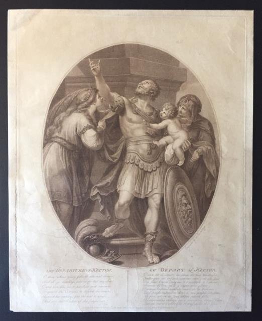 Londra, 1830 circa. Incisione in rame all'acquaforte virata al seppia, cm 136 x 44,5. Margine inferiore rifilato alla battuta, tracce ai margini laterali, discreto stato. Francesco Bartolozzi (Firenze, 1727 - Lisbona, 1815) disegnatore, pittore e incisore italiano, figlio di un orefice fiorentino. Nella bottega paterna cominciò a prendere confidenza con il disegno e con la pratica dell'incisione; ancora adolescente si trasferì a Venezia, dove perfezionò la sua arte alla scuola del Wagner, raggiungendo rapidamente notorietà e fama. Il segreto dello straordinario successo di cui godette costantemente già in vita si deve soprattutto all’originale sua tecnica che tanto piaceva allo spirito del Settecento, l'incisione a puntini (pointellisme). Benché creata in Italia da Giulio Campagnola e frequentemente adoperata, questa tecnica è rimasta soprattutto legata al nome di Bartolozzi che ne ricercò le possibilità, ne sfruttò le risorse e ne perpetuò la pratica attraverso una fiorentissima scuola da lui stesso fondata. Il Bartolozzi arrivò poi a quella sua inconfondibile maniera grazie al suo temperamento sempre orientato alla grazia e alla leggiadria, con gusto e armonia. Nel 1764, chiamato dal Dalton, bibliotecario di Giorgio III, si recò a Londra. Qui l'incisione era all’epoca tutta orientata alla maniera nera o al mezzotinto ma cominciava pian piano a percepire la maniera punteggiata (stipple engraving) che il Ryland aveva lanciato con successo. E qui Bartolozzi trovò fertile terreno, sì che in breve divenne il massimo esponente di questa tecnica. Quattro anni dopo entrava a far parte della costituenda Accademia Reale. Ebbe una schiera numerosa e attiva di discepoli, fra i quali Minesi, Schiavonetti, Tomkins, Cheesman, Ogborne, Marcuard. Pare che oltre duemila stampe portino il suo nome: allegorie, ritratti, soggetti di storia e di genere, copie dall'antico, illustrazioni, frontespizi, diplomi, avvisi di teatro, annunzi, biglietti e inviti per balli e concerti, il tutto sempre intagliato con grazia e robustezza, freschezza e virtuosità incomiabili. Per corrispondere alle esigenze di un simile lavoro, egli doveva ricorrere non solo all’aiuto degli allievi ma anche alla collaborazione di artisti che gli fornissero soggetti da incidere. Ne ebbe moltissimi: da Gian Battista Cipriani che ritrovò a Londra, ad Angelica Kauffmann, Hamilton e Wheatley, e da tutti ricevette figurazioni allegoriche felici. Le opere completamente sue, pur non molte, restano in compenso piccoli capolavori. Basti ricordare “L'Origine del Disegno,” “Il Giardino dei Putti”, “Il Mercato dell'Amore”, tutte ammirevoli per sobrietà ed efficacia di esecuzione. Nel ritratto non dimostrò una paritetica maestria ma incise con abilità le opere di grandi maestri come Gainsborough, Reynolds, Lawrence, e Copley, arrivando a ottenere re equivalenze del colore grazie a ingegnose e inesauribili combinazioni di linee e di punti. Nelle stampe dei suoi rami si compiacque di un inchiostro tipico, il cosiddetto “Rosso Bartolozzi” e amò pure cercare con accorgimento effetti di vero colore. Il suo segreto consisteva nell’inchiostrare completamente il rame col tono dominante, che toglieva poi coi veli il più possibile. Le tracce rimanenti fondevano e armonizzavano a meraviglia i vari colori, che venivano applicati successivamente, dai più scuri ai più chiari, su una unica lastra, in modo da ottenere la prova con una sola tiratura. Nel 1802 lasciò l'Inghilterra per recarsi a dirigere l'Accademia Nazionale di Lisbona. Qui continuò a lavorare con lena e gioia inalterate fino alla morte. (Fonte Treccani) (Bibl.: T. W. Tuer, Bartolozzi and his works, Londra 1881; S. Brinton, Bartolozzi and his works, Londra 1881; id., Bartolozzi and his pupils in England, Londra 1903; I. T. Herbert Bailly, F. B., Londra 1907; P. Kristeller, in Thieme-Becker, Künstler - Lexikon, II, Lipsia 1908; A. Baudi di Vesme, F. B., Milano 1928; A. Calabi, F. B., Milano 1929). .