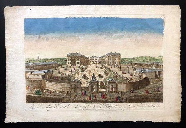 Chez Basset, Paris, May 1756 (in lastra). Incisione in rame all'acquaforte, cm 29 x 43 (alla lastra), 34,5 x 52 8(al foglio). Veduta ottica di pochi successiva alla fondazione del noto orfanotrofio “Foundling Hospital”, fondato a Londra nel 1739 dal capitano di mare e filantropo Thomas Coram. Usuale patina di sporco e imperfezioni ai margini che sono ampi, in vivace coloritura, buono stato di conservazione.
