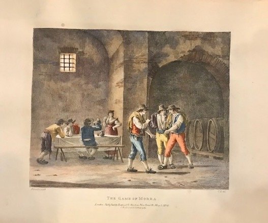 Litografia originale (cm. 25,5x20,5 più ampi margini bianchi) tratta da ‘Roman costumes drawn from nature by Pinelli and C. Hullamandel & on stone by C. Hullmandel’. Raffinata coloritura all’acquarello. Esemplare in ottimo stato di conservazione. Rara.