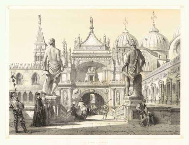 Veduta della Scala dei Giganti, presa da Palazzo Ducale. Visto di spalle, il Doge scende la scalinata, in primo piano le statue di Marte e Nettuno e alcuni personaggi