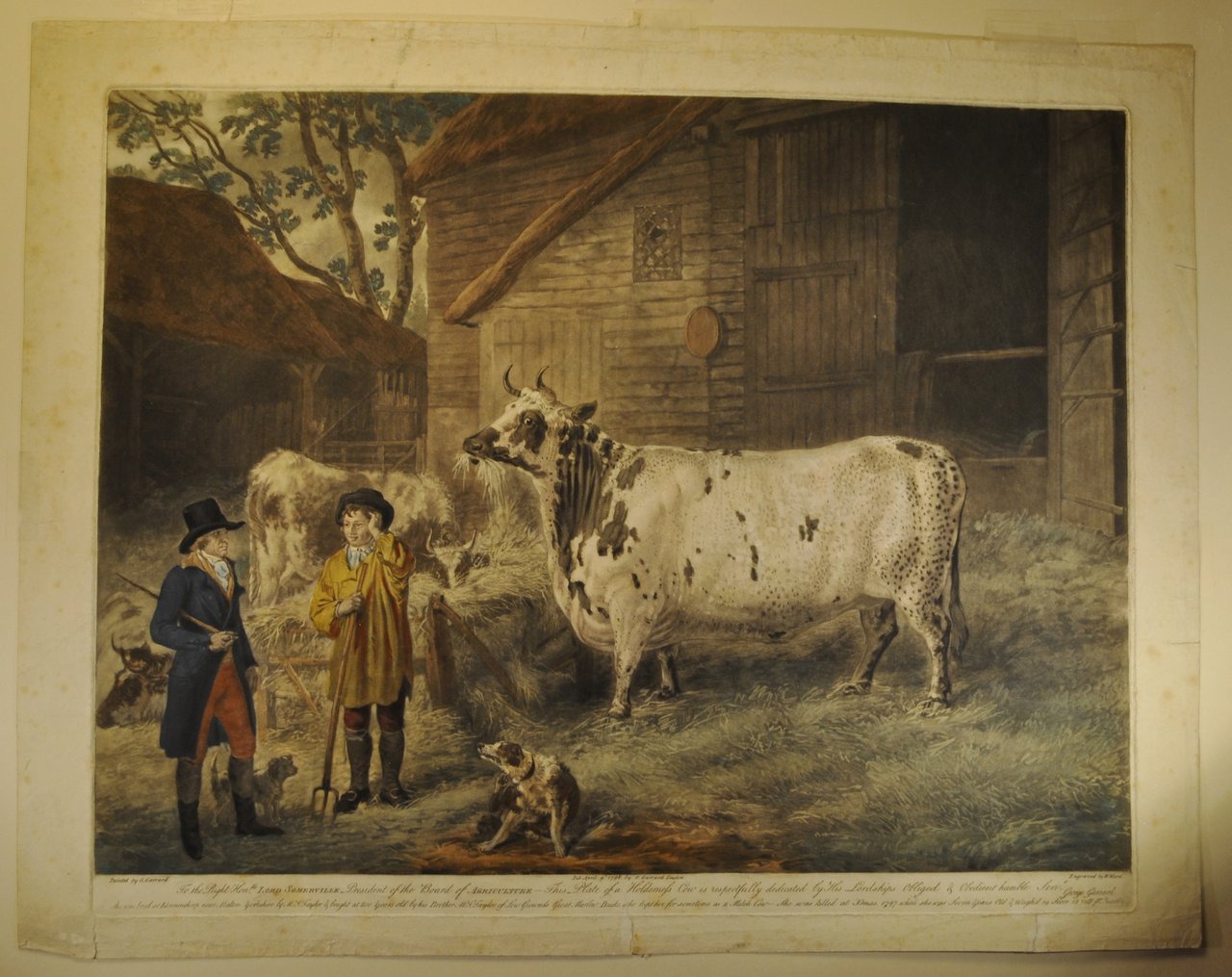 Acquatinta di mm 607 x 454 su carta di cellulosa molto pesante, in perfetta coloritura d'epoca. In basso nel cartiglio "To the right Hon.ble Lord Somerville President of the Board of Agriculture. This Plate of a Holderness Cow is respectfull dedicated by His Lordship Obliged humble Servt. George Garrand" e subito sotto "She was bred at Kenninthorp near Malton Yorkshire by M.r J. Taylor , & bought at two years old by his Brother Mr T. Taylor of Low Grounds. Great Marlow Bucks who kept her for sometime as a Milch Cow - She was killed at Xthmas 1797 when she was Seven Years Old & weighid 19 Score 12 1/2tt p. quarter". William Ward (1762-1826) fu uno dei più dotati incisori inglesi; assieme al fratello James, di cui incise i dipinti, diedero vita alla più notevole produzione artistica di ambito "agricolo" di tutto il Regno Unito.