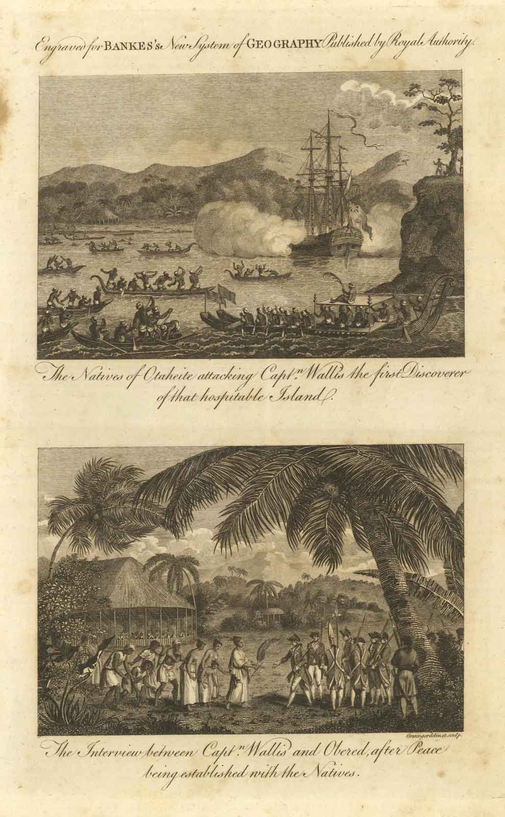 The natives of Otaheite attacking Capt.n Wallis the first discoverer of thet hospitable island - The interview between Capt.n Wallis and Obered. with the natives