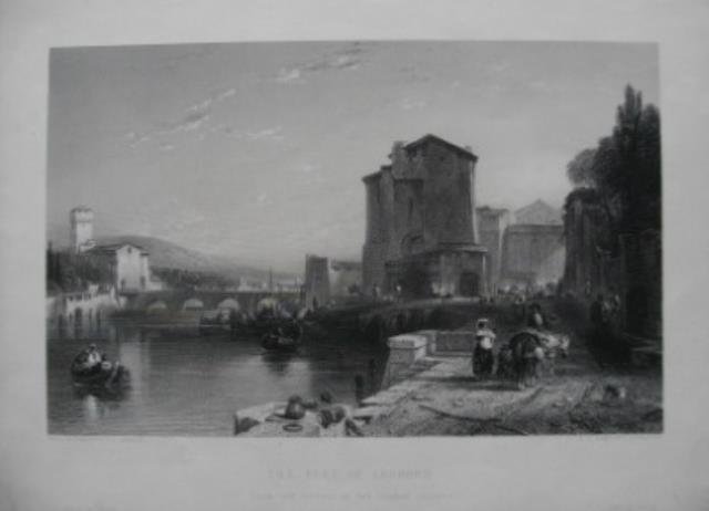 Inghilterra, 1850 circa. Incisione su acciaio, b/n, cm 23 x 31,5 (il foglio) più margini bianchi. Veduta che reca il titolo di "Il Porto Livorno" ma che raffigura in realtà la cittadella di Pisa. In margini e in buono stato di conservazione.
