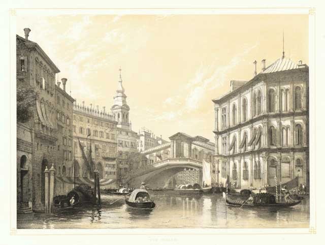 Decorativa veduta del Canal Grande, con i palazzi che si stringono intorno al famoso ponte. In primo piano gondole e barche con mercanzie