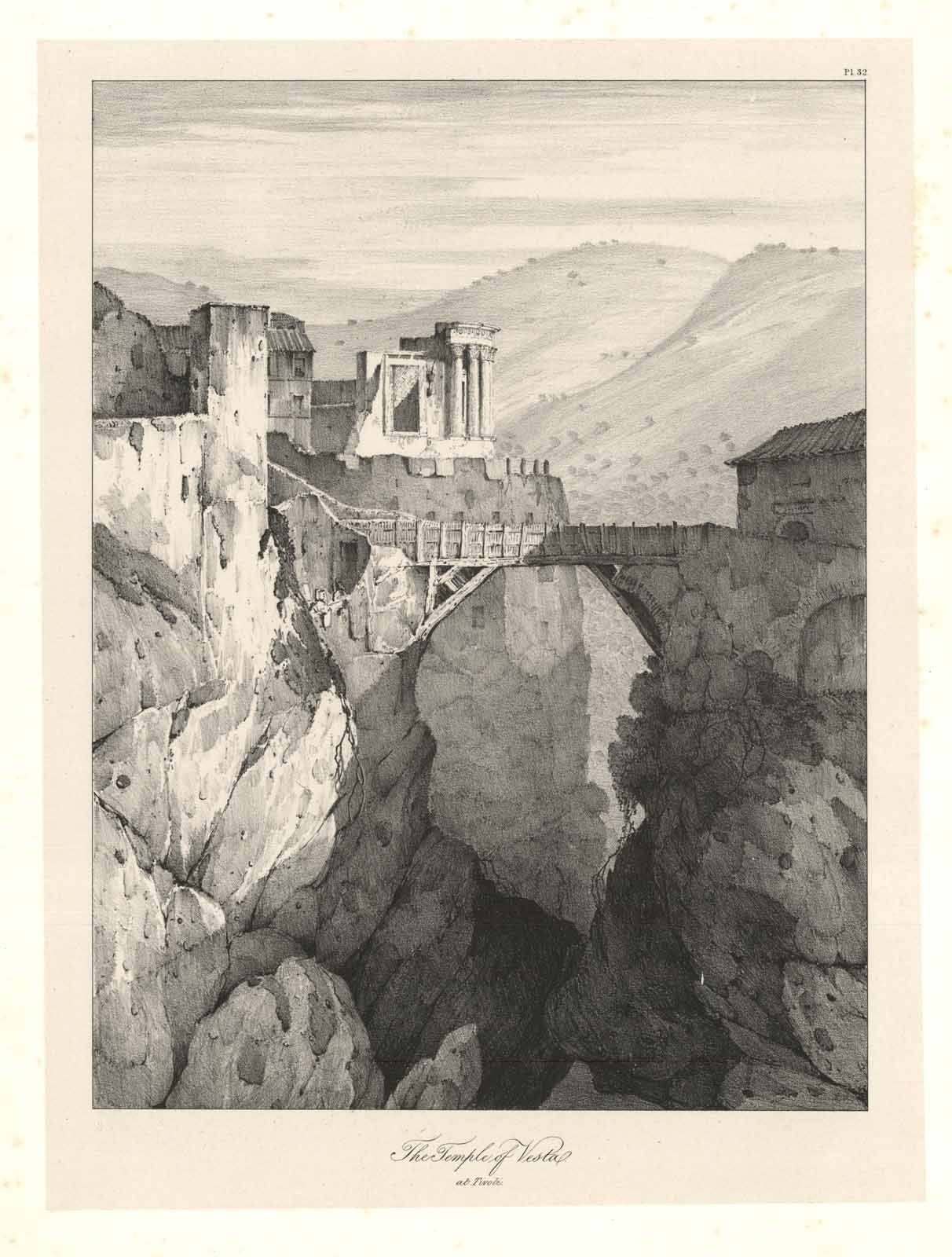 Litografia, stampata su carta della cina, tratta da un disegno di William Linton eseguito durante il suo tour in Italia negli anni 1828 e 1829. "In order to preserve perfectly the fidelity, spirit, and character of the originals, which were taken in pencil, they will be repeated in the same free and sketchy style by Drawings executed by himself, on Stone". L'opera, in cui si trova inserita la veduta, "Sketches in Italy: Being a selection." dedicata a Sua Maestà William IV è da considerarsi una delle più importanti del Grand Tour del XIX prodotta da un artista inglese; uscì in dodici fascicoli, ciascuno contenente 8 illustrazioni, pubblicati ogni due mesi.Ottimo stato di conservazione.Linton William (1791-1876) Il suo stile e la sua opera furono influenzati da Richard Wilson, il grande paesaggista gallese (1714-1782), per l'ampia composizione panoramica, nonché dall'opera di Claude Lorrain (1600-1682), di cui studiò gli effetti della luce naturale, e da Claude-Joseph Vernet (1714-1789), per la sua idealizzazione del classicismo. Nel 1817 si stabilì a Londra ed espose alla Royal Academy e alla British Institution. Nel 1823-24 ebbe parte attiva nella fondazione della Society of british Artists, della quale fu anche presidente nel 1837. Nel 1828-29 effettuò il lungo viaggio da cui scaturì la pubblicazione in due volumi in cui è inserita la presente veduta. Alcuni anni più tardi ne compì uno ancor più lungo nel Mediterraneo, visitò la Grecia, da cui scaturì l'opera "The scenery of Greece and its islands", edita nel 1850, la Sicilia, ancora il sud dell'Italia e il sud della Francia. Il risultato di questi viaggi fu un grande numero di schizzi e disegni che costituirono la base per i suoi dipinti di paesaggi di grandi dimensioni; per tale motivo fu definito "il nuovo Richard Wilson" e fu messo in comparazione con un altro grande artista del suo tempo: J.M.W. Turner. Il British Museum e la Tate Gallery conservano tra le sue opere anche quadri di vedute italiane.Rif: Vescarelli, p. 238; Benezit, Dictionnaire des Peintre…; Grant, A Dictionary of British Landscape Painters.