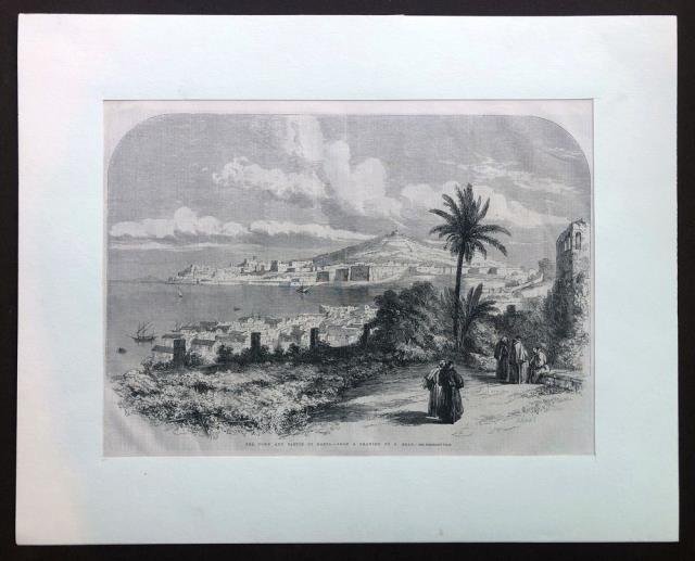 1880 circa. Tratta dal “The Illustraded London News”, Londra, Sept. 1860. Incisione su legno, b/n, cm 27,5 x 40,5 (il foglio). Bella veduta generale della città e del golfo di Gaeta animata da frati su una terrazza a bellavista, con passpartout. Ottimo stato di conservazione.