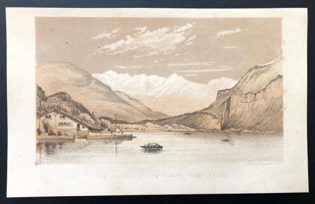 1850 circa. Litografia stampata in colore, cm 12 x 19 circa (il foglio). Meyringen è un comune svizzero nel Canton Berna, circondario di Interlaken, regione dell' Oberland. Buono stato. .