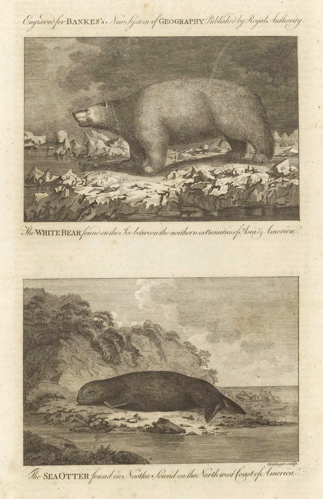 Incisione, antica ed originale, inserita nell'opera "A New, Royal, Authentic and Complete System of Universal Geography, Ancient and Modern: Including All the Late Important Discoveries Made by the English, and Other Celebrated Navigators . History and Description of the Whole World. Likewise the Essence of the Voyages of the Most Enterprising Navigators." edita a Londra da J. Cooke nel gennaio del 1787. Autore: Bankers Thomas, Edward Warren Blake, Alexander Cook. Luogo: America - Orso bianco - Lontra di mare. Anno: 1787. Tecnica: incisione in rame. Dimensioni: 370x240 il foglio mm
