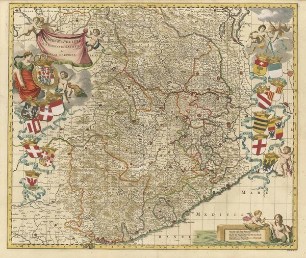 Carta geografica del teatro della guerra in Piemonte, Savoia e Delfinato. Il titolo, in alto a sinistra, si trova iscritto in un drappo sorretto da tre putti alati. Le armi dei vari territori rappresentanti inframezzati dal nastro anch'esso sorretto da alcuni putti conferiscono particolare valore decorativo alla composizione. Nell'angolo in basso a destra sono riportate le scale grafiche 'Milliaria Pedemontana 50 uni Gradui, Milliaria Italica 60 uni gradui, Milliaria Germanica 15 uni gradui'. Pieghe editoriali, gradevole coloritura all'acquerello