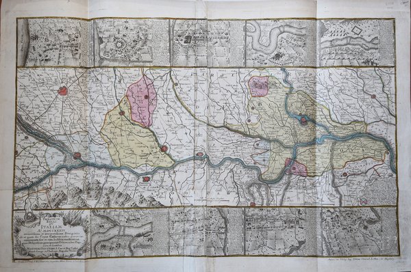 Magnifica e grande carta murale, raffigurante i luoghi teatro della guerra in Italia del 1734.Stampata a parte, probabilmente deriva da una delle edizioni dell'atlante del Seutter. La carta, molto decorativa, è adornata da numerose piante delle città coinvolte nella guerra e da piani dei principali luoghi sedi delle battaglie quali: Milano, Cremona, Mantova, Guastalla, Parma, Mirandola, Pavia, Piacenza, Pizzighettone e Tortona. Matthäus Seutter (1678 - 1757) fu uno dei più importanti e prolifici editori tedeschi di mappe del XVIII secolo. Attivo, come incisore sotto la tutela dell'importante J. B. Homann. All'inizio del 1700 Seutter lasciò Homann per tornare ad Augusta, dove lavorò per l'importante editore d'arte Jeremia Wolff (1663 - 1724), per il quale incise mappe e altre stampe. Intorno al 1717 fondò la propria casa editrice cartografica indipendente ad Augusta. La maggior parte delle mappe di Seutter sono pesantemente basate, se non addirittura copie, di lavori precedenti fatti dalle calcografie Homann e De L'Isle. Ciononostante, dal 1731/32 Seutter era uno degli editori più prolifici del suo tempo e fu onorato dall'imperatore tedesco Carlo VI che gli diede il titolo di Geografo Imperiale, dopo il quale la maggior parte delle mappe successive includeva la denominazione ' Avec Privilege. ' Seutter continuò a pubblicare fino alla sua morte, all'apice della sua carriera, nel 1757. Incisione in rame su tre lastre, stampata su tre fogli uniti verticalmente, bellissima coloritura coeva, dimensioni totali 1140x570. Molto rara. Magnificent and large map that describes the theater of the war in Italy of 1734.Printed separately, it probably derives from one of the Seutter's atlas editions. Very decorative, is adorned by numerous plants of the cities involved in the war: Milan, Cremona, Mantua, Guastalla, Parma, Mirandola, Pavia, Piacenza, Pizzighettone and Tortona. Mattha?us Seutter (1678 - 1757) was one of the most important and prolific German map publishers of the 18th century. Seutter was born the son of a goldsmith but apprenticed as a brewer. Apparently uninspired by the beer business, Seutter abandoned his apprenticeship and moved to Nuremberg where he apprenticed as an engraver under the tutelage of the prominent J. B. Homann. Sometime in the early 1700s Seutter left Homann to return to Augsburg, where he worked for the prominent art publisher jeremiad Wolff (1663 - 1724), for whom he engraved maps and other prints. Most of Seutter's maps are heavily based upon, if not copies of, earlier work done by the Homann and De L'Isle firms. Nonetheless, by 1731/32 Seutter was one of the most prolific publishers of his time and was honored by the German Emperor Karl VI who gave him the title of Imperial Geographer, after which most subsequent maps included the Avec Privilege designation. Copper engraving on three plates, printed on three sheets vertically, beautiful color, total size 1140x570. Very rare. Cfr.