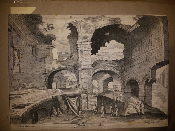 Acquaforte, 170 x 238 mm. Prima edizione. Stato I/II. Filigrana con monogramma di Hendrick Van Cleve: mano con quadrifoglio. In basso sotto l'immagine incisa: a sinistra "Henri. Cliven. inven", al centro il titolo, a destra "Philipp. Gall. excud.". Fa parte di "Ruinarium varii prospetto ruriumque aliquot delineationes" Hendrick o Hendrik van Cleve III (1525-1589) era un pittore e incisore fiammingo, figlio e allievo di Willem van Cleve il Vecchio e fratello maggiore di Marten van Cleve il Vecchio e di Willem Van Cleve il Giovane. Viene chiamato "il terzo" per differenziarlo da Hendrik van Cleve I (registrato come maestro della Corporazione di San Luca 1489/90) e Hendrick II (Gilda di San Luca, 1534). Hendrick III andò in Italia da giovane, e tornò nel suo paese natale, buon pittore di paesaggi. Le sue immagini si distinguono per una leggerezza insolita del tatto e un eccellente tono di colore. Gli sfondi delle opere storiche di suo fratello Marten e di Frans Floris sono spesso dipinti da questo artista e sono armonizzati con le figure con grande intelligenza. "Storia del figlio prodigo" nel Belvedere di Vienna è sua. Fu accolto nella Gilda di San Luca ad Anversa nel 1551. Hendrick van Cleve si è distinto come incisore. Molte delle sue incisioni si riferiscono a paesaggi e vedute vicino a Roma. Una serie di trentotto tavole di questo artista, dal titolo Ruinarum varii prospectus, ruriumque aliquot delineationes, pubblicato da Theodoor Galle. Morì ad Anversa tra il 1590 e il 1595. Hollstein, Dutch and Flemish etching engravings and woodcuts ca. 1540-1700, v. 4., p. 170