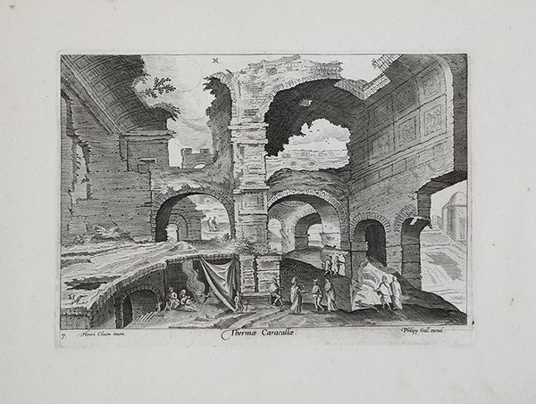 Veduta tratta dalla raccolta Ruinarum varii prospectus, ruriumque aliquot delineationes pubblicato da Philip Galle con incisioni tratte da disegni di Hendrick van Cleve o Cliven III. Figlio e allievo di William van Cleve, si trasferisce in Italia nella metà del XVI secolo; oltre ad un dipinto raffigurante una veduta di Roma, datato 1550, realizza un cospicuo numero di disegni che serviranno come modelli per l’opera incisa, realizzata al ritorno ad Anversa e pubblicata nel 1587. Le vedute, che raffigurano principalmente Roma ma anche altre città europee, recano in basso l’iscrizione “Henri. Cliven. inven." o "Henri Cliven pingebat" che ne attestano la derivazione ma non l'autografia. È certo che Hendrick viaggiò in Italia. Gli studiosi non sono d'accordo sui tempi del suo soggiorno, che alcuni collocano prima del 1551, anno in cui divenne maestro della Gilda, mentre altri lo collocano tra il 1551 e il 1555, data in cui si sposò. In Italia fece molti disegni di vedute di montagne, edifici e paesaggi urbani, che poi utilizzò nelle sue opere. Sulla base dei suoi disegni noti di città italiane, probabilmente trascorse del tempo a Roma, Firenze e Napoli. Hendrick van Cleve era un artista di paesaggio, creando sia vedute topografiche che paesaggi immaginari. I suoi paesaggi sono in stile italianizzante e tipicamente raffigurano ampie vedute con rovine che possono essere o meno interamente immaginarie. Le rovine sono di solito una compilazione di elementi caratteristici dell'architettura classica. Alcune sono basate su rovine esistenti che possono essere identificate, mentre altre sono costruzioni completamente di fantasia dell’artista. I disegni di Hendrik van Cleve furono quindi usati dai tipografi contemporanei di Anversa. Due serie di stampe secondo i disegni di van Cleve furono pubblicate dal famoso incisore ed editore Philips Galle. La prima serie, Regionem, rurium, fundormumq[ue], varii atove amoeni prospectus fu pubblicata nel 1587. Consiste di 10 tavole che raffigurano principalmente paesaggi pastorali immaginari con rovine. Hendrik van Cleve è menzionato come disegnatore su ogni stampa e Philip Galle come incisore. La seconda serie intitolata Ruinarum varii prospectus, ruriumq[ue] aliquot delineationes non è datata ma fu probabilmente pubblicata intorno allo stesso periodo della prima. Le 38 stampe mostrano vedute mediterranee. Non è chiaro chi abbia inciso questa serie. La firma con il monogramma di H. van Cleve appare su tutte le 38 incisioni, ad eccezione dell'incisione n. 22 della serie. Anche la firma di Philip Galle appare su tutte le incisioni mentre quella di suo figlio Theodoor appare solo su una. Anche Hendrick van Cleve stesso potrebbe essere stato l'incisore della serie. Incisione al bulino, bella impressione su carta vergata coeva, in ottimo stato di conservazione. A nice view taken from the rare Ruinarum vari prospectus ruriumq. Aliquot delinationes. Hendrick van Cleve or Cliven III, son and pupil of William van Cleve, moved to Italy in the second half of the XVI century; besides a painting depicting a view of Rome (1550), he realized a considerable amount of drawing which he afterwards used as preparatory for the engravings he realized in Antwerp and published by Philip Galle in 1587. The views, whose main subject is Rome but there are also other European cities, bear the inscription “Henri. Cliven. inven" or "Henri Cliven pingebat" on lower part, which testify their origin, but not necessarily the fact that he realized them. It is certain that Hendrick travelled to Italy. Scholars disagree about the timing of his stay in Italy. Some place it before 1551, the year in which he became a master of the Guild, while others place it between 1551 and 1555, the date on which he got married. In Italy he made many drawings of mountain views, buildings and cityscapes, which he later used in his works. Based on his known drawings of Italian cities, he likely spent time in Rome, Florence and Naples. Hendrick van Cleve was a landscape artist. He created topographical views as well as imaginary landscapes. His landscapes are in the Italianising style and typically depict wide views with ruins that may or may not be entirely imaginary. The ruins are usually a compilation of characteristic elements from classical architecture. Some are based on existing ruins which can be identified. Others are completely fabricated constructions Hendrik van Cleve's drawings were used by contemporary printmakers in Antwerp as designs. Two series of prints after van Cleve's designs were published by the renowned engraver and publisher, Philips Galle. The first series, Regionem, rurium, fundormumq[ue], varii atove amoeni prospectus was published in 1587. It consists of 10 plates that mainly depict imaginary pastoral landscapes with ruins. Hendrik van Cleve is mentioned as the designer on each print and Philip Galle as the engraver. The second series entitled Ruinarum varii prospectus, ruriumq[ue] aliquot delineationes is undated but was likely published around the same time as the first one. The 38 prints show Mediterranean views. It is not clear who engraved this series. H. van Cleve's signature and monogram appear on all 38 engravings with the exception of engraving n.22 of the set which lacks the monogram. Philip Galle's signature also appears on all the engravings while that of his son Theodoor appears on engraving only. Hendrick van Cleve III may also have been the engraver as his monogram is present on the print. Engraving, good impression on contemporary laid paper, very good conditions. Cfr. Hollstein, F. W. H. Dutch and Flemish Etchings, Engravings, and Woodcuts, v.4, pl.170, n.1-38 and v.7, p.80, n.423-460.
