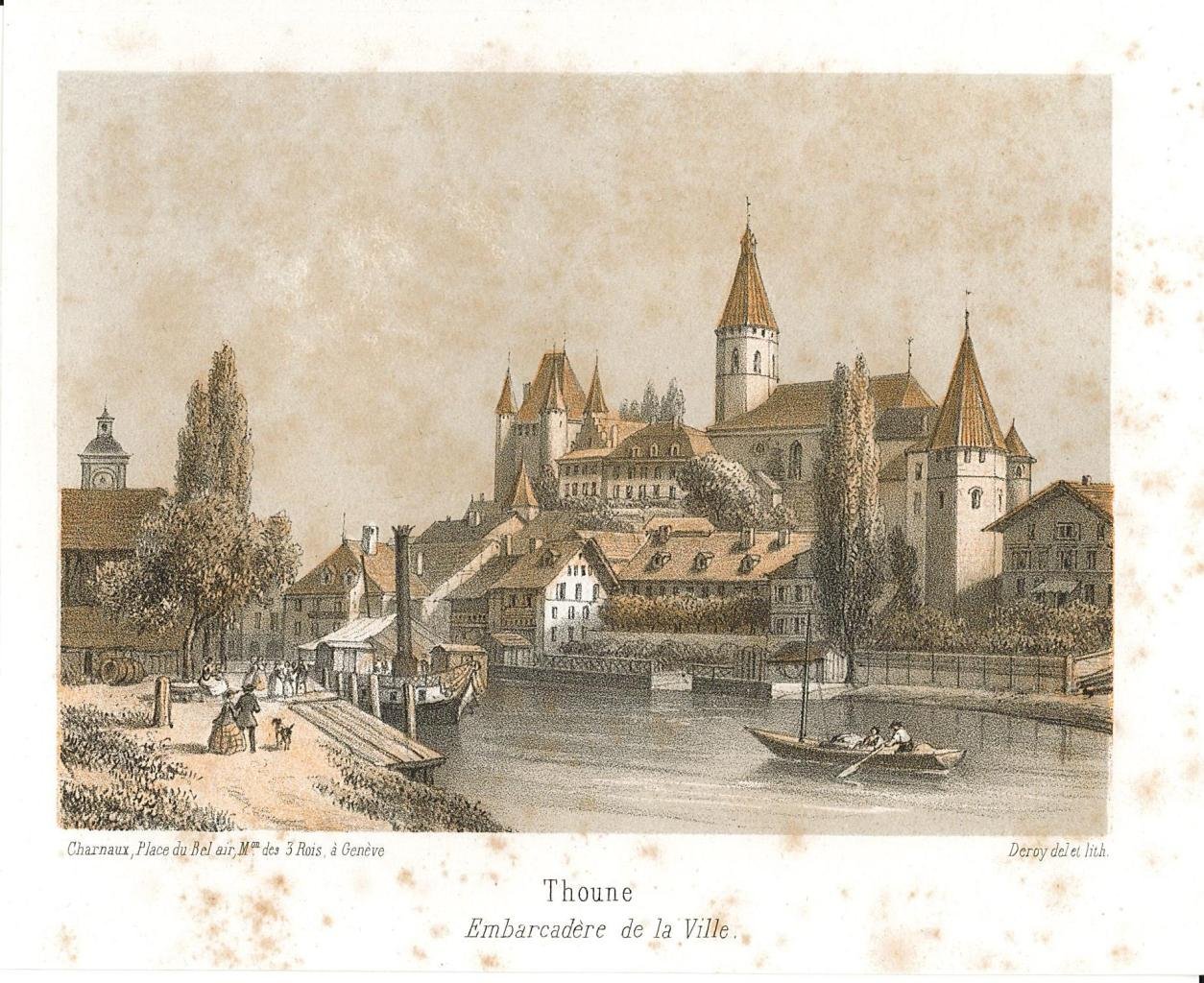 Veduta, antica ed originale, stampata a colori raffigurante il porto di Thoune. Edita da Charnaux a Ginevra. Autore: Deroy lith. Luogo: Thoune. Anno: 1840 ca. Tecnica: litografia. Dimensioni: 100x135. . Leggero foxing