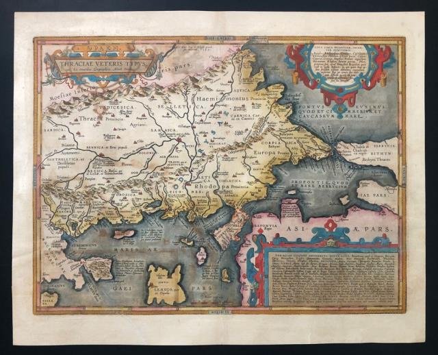 Anversa, 1608 circa. Dal “Theatrum Orbis Terrarum”, incisione in rame, originale coloritura d'epoca, cm 36 x 48 circa (alla lastra), cm 43,5 x 53,5 (il foglio), testo italiano al verso, in alto a sn. titolo entro cartiglio dalla semplice forma geometrica e lineare e volute, a ds. sottotitolo didascalico entro cartiglio circolare e volute. Una delle rare versioni con testo italiano al verso. Alcuni restauri professionali abilmente eseguiti non disturbano questa bella carta che si presenta a pieni margini e in splendida coloritura coeva. Il "Theatrum Orbis Terrarum" è stato il primo atlante moderno, comprendente carte di tutte le zone del mondo. Prima di allora la produzione cartografica era stata irregolare, locale a livello di produzione, e i pochi atlanti, i cosiddetti "Atlanti Lafreriani" erano costituiti su richiesta, raccogliendo carte di alcune zone e ignorando le altre. La geniale intuizione di Ortelio fu appunto quella di riunire, in un unico corpus, la produzione cartografica del periodo, costituendo la base per un'impresa editoriale di enorme successo che sarebbe stata pubblicata dal 1570 al 1612. Vivente l'autore, non meno di venticinque edizioni si susseguirono nei vari paesi d'Europa e molte di esse vennero integrate (circa 17 carte nuove nell'edizione 1573; 26 nell'edizione 1580; 24 in quella del 1590), mentre non di rado carte vecchie furono sostituite da nuove migliori. Anche dopo la morte dell'autore furono pubblicate fino al 1612 altre edizioni ampliate; e un'edizione italiana fu curata da Filippo Pigafetta. La Tracia è una regione storica, posta nell'estrema punta sudorientale della penisola balcanica. Rispetto ai confini odierni, comprende il nordest della Grecia, il sud della Bulgaria e la Turchia europea.