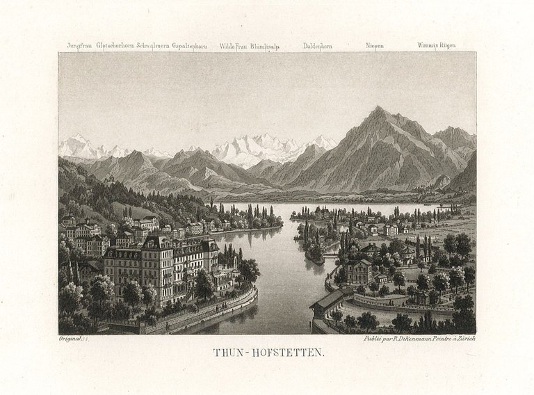 Stampa, antica ed originale, raffigurante il lago di Thun in raffinata acquatinta. Inserita nell'opera "Souvenir de la Suisse" edita a Zurigo. Autore: Dikenmann Rudolf dis. (1793 Zürich 1883). Luogo: Thun. Anno: 1860 ca. Tecnica: acquatinta. Dimensioni: 74x112 mm