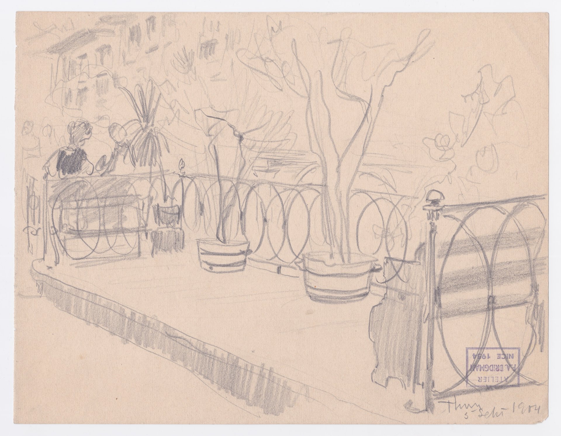 Nel foglio, probabilmente tratto da un quaderno di schizzi presi dal vero, il taglio diagonale della composizione mette in risalto lo spazio vuoto delimitato da una ringhiera, due vasi con piante e una panchina. La scena si svolge nella cittadina svizzera di Thun e probabilmente è raffigurata una terrazza sul fiume Aar. Poco oltre danno le spalle due figure sedute che sembrano conversare. Sullo sfondo chiudono la scena alte facciate di due palazzi. A matita in basso a destra: Thun/5 set.1904. Timbro quadrato dell'autore: Atelier/F.A. Bridgman/Nice 1954.