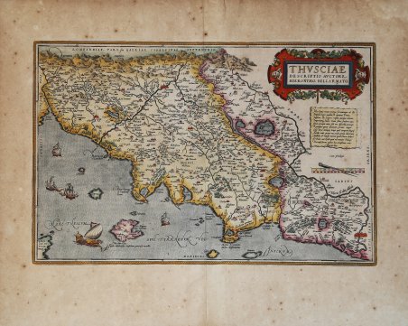 Decorative e dettagliata mappa della Toscana, dall'edizione francese del 1598 del Theatrum Orbis Terrarum di Ortelius, il primo atlante moderno del mondo. La mappa si basa sulla mappa regionale di Girolamo Bellarmati (Bellarmato) ed include un cartiglio ornato e un numero di navi a vela. Carta tratta dal ' Theatrum Orbis Terrarum ' e che è considerato il primo vero “atlante” moderno. L’opera fu pubblicata in 7 lingue e 36 edizioni, per il quale – nel 1570 - Ortelius ottenne il ' privilegio, ovvero una sorta di diritto d'autore che impediva ad altri cartografi di pubblicare i propri lavori. Il ' Theatrum ' rappresentava il lavoro più avanzato del lavoro della descrizione cartografica. L’Ortelius vi raccolse il sapere geografico e cartografico del suo tempo, proponendo in 147 spettacolari tavole incise l’immagine più fedele del mondo allora conosciuto e, in alcune straordinarie “carte storiche”, regioni e itinerari tratti dalla letteratura, dalla mitologia, dalla tradizione. Ortelius fu anche il primo a citare le fonti, menzionando i nomi dei cartografi nel “catalogus auctorum”. Dal 1598 al 1612 le edizioni postume del ' Theatrum ' furono realizzate dal suo collaboratore Johannes Baptiste Vrients. Incisione in rame, eccellente coloritura coeva, in ottimo stato di conservazione. Decorative and detailed map of Tuscany, from the 1598 French edition of Ortelius' Theatrum Orbis Terrarum, the first modern atlas of the world. The map is based upon the regonal map of Girolamo Bellarmati. Includes an ornate cartouche and a number of sailing vessels. Centered on Florence, with Rome in the lower right corner. Map taken from the ' Theatrum Orbis Terrarum, which is considered the first true modern "Atlas". The work was published in 7 languages and 36 editions, for which - in 1570 - Ortelius obtained the privilege, a kind of copyright that prevented other cartographers from publishing his works. The ' Theatrum ' represented the most advanced work of cartographic description. Ortelius collected in it the geographical and cartographic knowledge of his time, proposing in 147 spectacular engraved plates the most faithful image of the world then known and, in some extraordinary "historical maps", regions and routes taken from literature, mythology, tradition. Ortelius was also the first to cite sources, mentioning the names of cartographers in the "catalogus auctorum". From 1598 to 1612 the posthumous editions of the ' Theatrum ' were made by his collaborator Johannes Baptiste Vrients. Copper engraving, contemporary coloring, in good condition. Cfr. M. Van den Broecke "Ortelius Atlas Maps" (2011), n. 130.