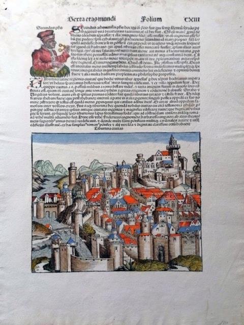 Anton Koberger, Norimberga, 1493. Dal “Liber Chronicarum Nurembergensi”, xilografia con veduta, cm 37,5 x 42 (il foglio), recente ma bella coloritura a mano. Antica pagina con testo latino soprastante e al verso, dove sono presenti anche nove figure fra santi,eretici, medici e pontefici. Possibili difetti ma nell'insieme ben conservato. .