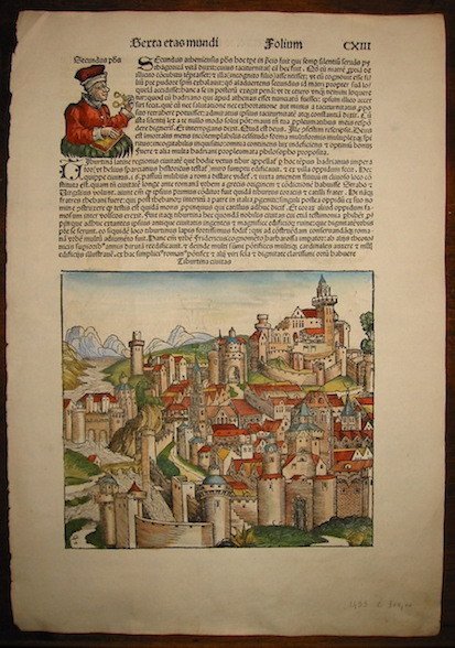 Xilografia originale (cm. 22,5x20 la veduta, cm. 31,5x45 il foglio) tratta dal celebre e monumentale ‘Liber Chronicarum’. Bella coloritura all’acquarello. Esemplare in ottimo stato di conservazione.