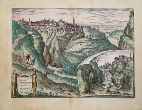 Questa è una veduta da nord-est della città di Tivoli, situata su un altopiano sopra la gola del fiume Aniene. La guglia della cattedrale di San Lorenzo sovrasta la città; sulla sinistra si trova il castello, noto come Roca Pia. A sinistra Abraham Ortelius e Georg Hoefnagel scendono il pendio durante la loro visita a Tivoli nel 1578. Hoefnagel sta dirigendo l'attenzione dell'osservatore verso l'imponente cascata dell'Aniene. ' L’opera è inserita nel ' Civitates Orbis Terrarum, il primo atlante devoto esclusivamente alle piante e vedute delle principali città del mondo. ' Il primo volume delle ' Civitates Orbis Terrarum ' fu pubblicato a Colonia nel 1572. Il sesto e ultimo volume apparve nel 1617. Questo grande atlante di città – cartografia urbana - curato da Georg Braun e inciso in gran parte da Franz Hogenberg, conteneva 546 prospettive, vedute a volo d'uccello e vedute cartografiche di città di tutto il mondo. Franz Hogenberg realizzò le tavole dei primi quattro volumi e Simon van den Neuwel (Novellanus, attivo dal 1580) quelle dei volumi V e VI. Georg Braun (1541-1622), un ecclesiastico di Colonia, fu il principale redattore dell'opera e fu molto aiutato nel suo progetto dalla vicinanza e dal continuo interesse di Abraham Ortelius, il cui ' Theatrum Orbis Terrarum ' del 1570 fu, come raccolta sistematica e completa di mappe di stile uniforme, il primo vero atlante. Le ' Civitates, ' in effetti, erano destinate ad accompagnare il ' Theatrum, ' come indicato dalla somiglianza dei titoli e dai riferimenti contemporanei sulla natura complementare delle due opere. Tuttavia, le ' Civitates ' erano progettate per avere un approccio più popolare, senza dubbio perché la novità di una raccolta di piante e vedute di città rappresentava un'impresa commerciale più rischiosa di un atlante mondiale, per il quale c'erano stati diversi precedenti di successo. Franz Hogenberg (1535-1590) era figlio di un incisore di Monaco che si era stabilito a Malines. Incise la maggior parte delle tavole del ' Theatrum ' di Ortelius e la maggior parte di quelle delle ' Civitates, e potrebbe essere anche indicato come il responsabile dell'origine del progetto. Oltre un centinaio di artisti e cartografi diversi, il più importante dei quali fu l'artista di Anversa Georg Hoefnagel (1542-1600), fornirono i disegni per le tavole delle ' Civitates. Hoefnagel non solo contribuì alla maggior parte del materiale originale per le città spagnole e italiane, ma rielaborò e modificò anche quello di altri collaboratori. Dopo la morte di Hoefnagel, il figlio Jakob continuò il lavoro per le ' Civitates. Gli autori della raccolta si proponevano di raffigurare "non icones et typi urbium", cioè non immagini generiche e tipizzate, "sed urbes ipsae admirabili caelaturae artificio, spectantium oculis subiectae appareant": non intendeva alludere o idealizzare, ma rappresentare fedelmente sulla carta, riprodurre esattamente, e in tempo reale, ciò che l'occhio vede, come annunciato nella prefazione al primo volume delle ' Civitates Orbis Terrarum. Incisione in rame, bella coloritura coeva, in ottimo stato di conservazione. This is a view from the northeast of the city of Tivoli, situated on a plateau above the gorge of the River Aniene. The spire of the cathedral of San Lorenzo rises above the city; on the left is the castle, known as the Roca Pia. On the left are Abraham Ortelius and Georg Hoefnagel descending the slope during their visit to Tivoli in 1578. Hoefnagel is directing the viewer's attention to the impressive waterfall of the Aniene. ' The work is included in the ' Civitates Orbis Terrarum, the first atlas devoted exclusively to plans and views of the world's major cities. Printed in six volumes between 1572 and 1617 it was so successful and widespread that several editions translated into Latin, German and French were printed. The first volume of the ' Civitates Orbis Terrarum ' was published in Cologne in 1572. The sixth and the final volume appeared in 1617. This great city atlas, edited by Georg Braun and largely engraved by Franz Hogenberg, eventually contained 546 prospects, bird-eye views and map views of cities from all over the world. Fransz Hogenberg produced the plates for the first four books, and Simon van den Neuwel (Novellanus, active since 1580) those for volumes V and VI. Georg Braun (1541-1622), a cleric of Cologne, was the principal editor of the work, and was greatly assisted in his project by the close, and continued interest of Abraham Ortelius, whose ' Theatrum Orbis Terrarum ' of 1570 was, as a systematic and comprehensive collection of maps of uniform style, the first true atlas. The ' Civitates, ' indeed, was intended as a companion for the ' Theatrum, ' as indicated by the similarity in the titles and by contemporary references regarding the complementary nature of two works. Nevertheless, the ' Civitates ' was designs to be more popular in approach, no doubt because the novelty of a collection of city plans and views represented a more hazardous commercial undertaking than a world atlas, for which there had been a number of successful precedents. Franz Hogenberg (1535-1590) was the son of a Munich engraves who settled in Malines. He engraved most of the plates for Ortelius's ' Theatrum ' and the majority of those in the ' Civitates, and may have been responsible for originating the project. Over a hundred of different artists and cartographers, the most significant of whom was Antwerp artist Georg Hoefnagel (1542-1600), engraved the cooper-plates of the ' Civitates ' from drawings. He not only contributed most of the original material for the Spanish and Italian towns but also reworked and modified those of other contributors. After Hoefnagel's death his son Jakob continued the work for the Civitates. The author set out to depict "non icones et typi urbium," that is, not generic and typified images, "sed urbes ipsae admirabili caelaturae artificio, spectantium oculis subiectae