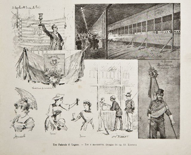 Xilografia originale composta da vignette: Venditrici di coccarde, Tiro di notte Controridotto, Alfiere portabandiere dei tiratori di Friburgo. Costumi di Berna Appenzell e Ticino. Testo al verso