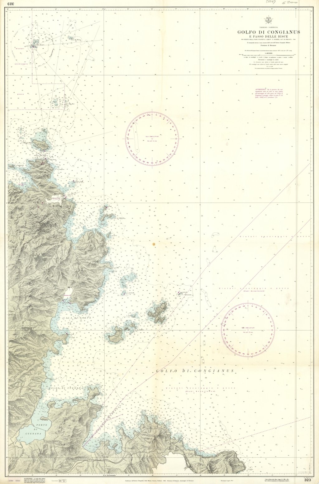 Carta nautica di grandi dimensioni molto dettagliata, scala 1:25000, con evidenziate le varie profondità dei fondali delle coste del Golfo di Congianus. Pieghe