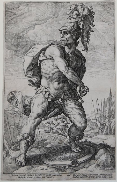 Bulino, 1586, firmato in lastra, in basso a sinistra "HG. fecit." e numerato 5. Nel margine inferiore, due colonne con distici in latino di Franco Estius. Della seire “Eroi romani”.Bellissima prova, impressa su carta vergata coeva, con filigrana stemma coronato con giglio, completa oltre la linea del margine, piega di carta nella parte superiore del foglio e piccole e lievissimi ossidazioni in corrispondenza dello scudo, piccoli restauri nel margine inferiore e lungo il margine sinistro, per il resto in ottimo stato di conservazione.L’incisione raffigura l’eroe romano Tito Manlio Torquato a figura intera, nell’atto di sguainare la spada. Sullo sfondo, su un ponte, si distingue il leggendario episodio, narrato da Livio (Ab Urbe Condita, VII, 10) in cui Tito Manlio trionfò su un gigante Gallo, spogliandolo della collana, che a sua volta indossò e gli valse il soprannome di Torquato (da torques, collana).L’opera fa parte di una serie di dieci tavole, intitolata “Memorabilia aliquot Romana strenuitatitis exempla”, più nota come Gli Eroi Romani, che consiste di 8 rappresentazioni di eroi, numerate 1-8, un frontespizio e una tavola allegorica finale non numerata.L’opera, dedicata da Goltzius all’imperatore Rodolfo II, venne pubblicata ad Haarlem nel 1586. Tutte le tavole recano versi in latino, scritti dall’umanista e neolatinista Franco Estius. Engraving, 1586, signed on plate in lower left corner "HG. fecit." and numbered "5". Beautiful example, printed on contemporary laid paper with watermark “crowned coat of Arms with fleur-de-Lis”, trimmed to the paltearm, small expert reapairs at the left sideand at the lower right corner, otherwise in good condition.With two columns of text, each two lines "Haud minimo Gallum . subire metu" provided by Franco Estius. From the series Memorabilia aliquot Romanae strenuitatis exempla, better known as “The Roman Heroes”.The hero Titus Manlius Torquatus, whole-length, wearing a plumed helmet, leaning back with one foot on a shield and drawing his sword from its scabbard. In the background you can see how he defeats a gigantic Gaul on a bridge.In 361 BC, Titus Manlius fought in the army of Titus Quinctius Poenus against the Gauls The Gauls had a giant among them, who - presenting himself as the champion of his tribe - bragged about his force and invincibility, and challenged the Roman commander Manlius. In single combat, Manlius slaughtered his opponent. He took the dead giant's gold collar and wore it himself, which lead to his second (nick)name Torquatus (torques meaning collar).This print is part of a series of ten prints, consisting of an unnumbered titlepage, eight numbered representations of heroes and an unnumbered final print.The series, printed in Haarlem in 1586 was dedicated to Emperor Rudolph II. Cfr. Hirschmann 1921 166; Hollstein 166.II; New Hollstein (Dutch & Flemish) 168.II (Hendrick Goltzius); Strauss 1977 235; Bartsch III.35.100.