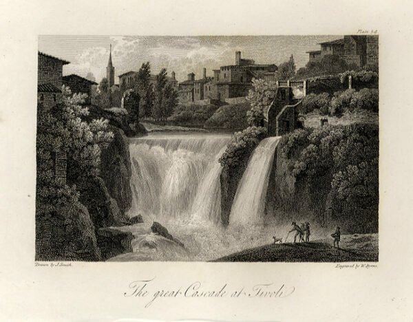 TIVOLI - "The Great Cascade at Tivoli" scenografica veduta delle cascate con edifici e rovine alle spalle. Viandanti in primo piano.