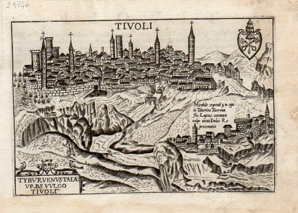TIVOLI - "Tivoli". Veduta prospettica con titolo, didascalia "Tibur venus tal urbs vulgo Tivoli" e stemma.