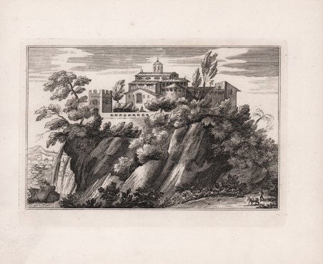 Acquaforte e bulino, circa 1670/80, priva di firma ed indicazioni editoriali. Rarissima veduta di Tivoli. L'opera, di probabile scuola francese, è priva di indicazioni editoriali. Appartiene ad una serie, anonima, di vedute prospettiche di città italiane di medio formato, sconosciuta a tutti i repertori bibliografici sulle vedute delle varie città italiane. Probabilmente la serie non ebbe mai una stesura definitiva e non fu pubblicata sotto forma di raccolta; per questo motivo non ne abbiamo trovato riscontro nei repertori librari. Tutte le vedute contengono elementi reali - oggettivi per l'identificazione iconografica - associati ad altri di pura fantasia. Nello stile dei paesaggisti francesi attivi in Italia nel XVII secolo, sullo stile dei dipinti e delle incisioni di Nicolas Poussin e Claude Lorraine. Le vedute di Roma presenti nella raccolta sono di chiara derivazione di quelle del fiammingo Lievin Cruyl, pubblicate nel ' Prospectus loco rum Urbis Romae Insignis, stampato a Roma nel 1666 da Giovan Battista De Rossi. Questo dettaglio ci induce a datare questa serie agli anni successivi, tra il 1670 e il 1680 circa. Le restanti vedute sono assolutamente originali e si discostano da tutti i modelli precedenti. Il presente esemplare è stampato su carta databile al XIX secolo. Una delle tavole in nostro possesso, che raffigura un paesaggio campestre non identificato, ' reca una firma solo parzialmente leggibile che, pertanto, non è stato possibile identificare. ' Etching and engraving, ca. 1670/80, unsigned and without printing details. The work, probably of the French school, is without any editorial indications. It belongs to an anonymous series of medium-format perspective views of Italian cities, unknown to all bibliographic repertories on views of various Italian cities. The series probably never had a final issue and was not published in the form of a collection; for this reason we have found no record of it in library repertories. All the views contain real elements-objective for iconographic identification-associated with others of pure fantasy. In the style of the French landscape painters active in Italy in the 17th century, in the style of the paintings and engravings of Nicolas Poussin and Claude Lorraine. The views of Rome in the collection are clearly derived from those of the Flemish Lievin Cruyl, published in ' Prospectus loco rum Urbis Romae Insignis, ' printed in Rome in 1666 by Giovan Battista De Rossi. This detail leads us to date this series to the later years, between about 1670 and 1680. The remaining views are absolutely original and so far from all previous models. The present example is printed on paper datable to the 19th century. One of the plates in our possession, depicting an unidentified country landscape, bears an only partially legible signature that, therefore, could not be identified. Very rare. Cfr.