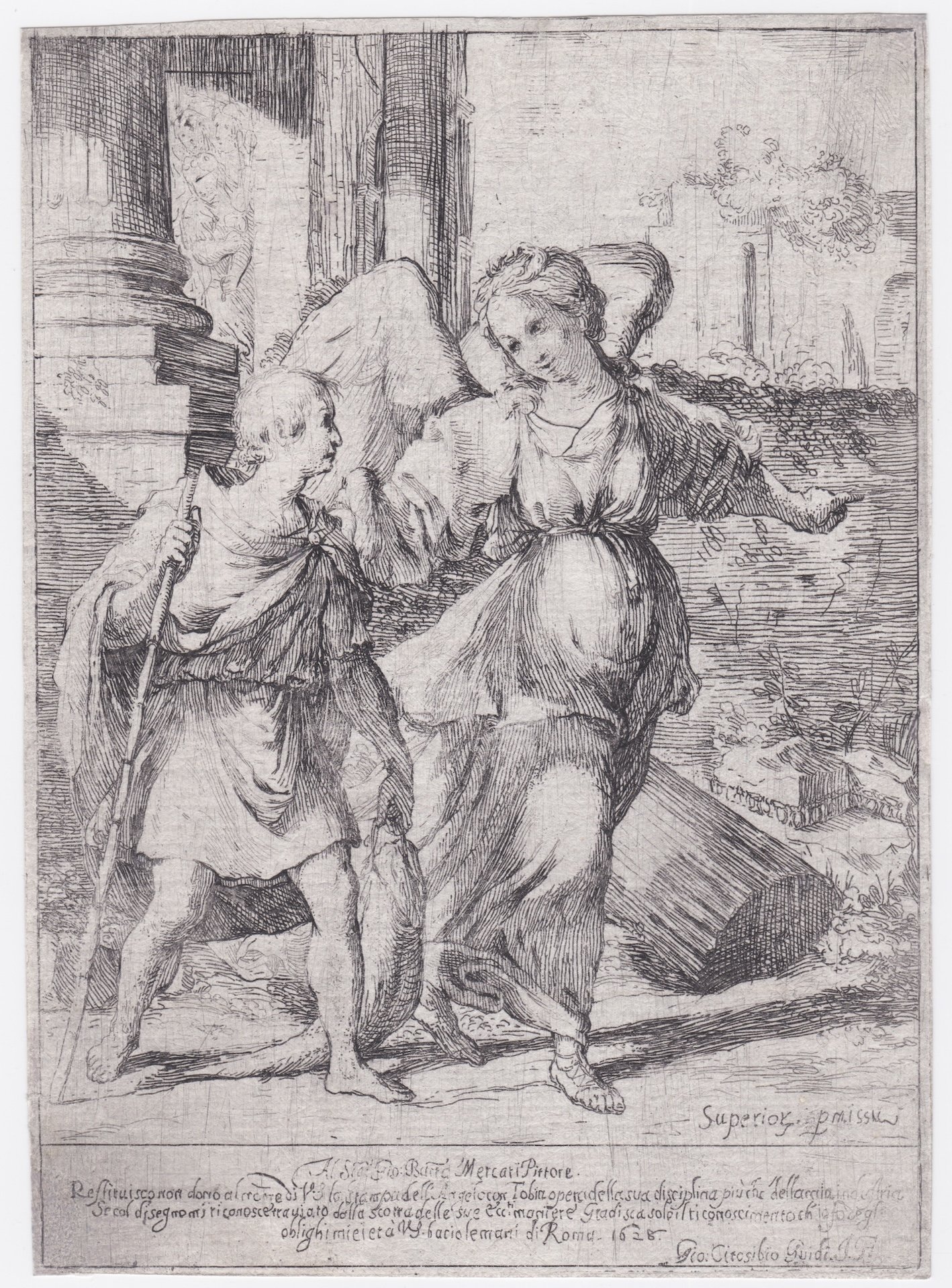 L'artista raffigura Tobia e l'Angelo a figura intera in un paesaggio caratterizzato da rovine, forse Roma. In basso a destra: Superior. permissu. Nel margine inferiore incisa la dedica a Giovanni Battista Mercati: Al SIg. Gio. Batta Mercati Pittore/ Restituisco non dono la al ? V S la stampa dell'Argelo con Tobia, opera della sua disciplina più che della mia industria/Se col disegno mi riconoscerrà ujato dalla scorta delle sue ecc.ti maniere. Gradisca solo il riconoscimento ch'io facegli/obblighi miei et a V.S. bacio le mani di Roma. 1628/ Gio Citosibio Guidi. I. F.”