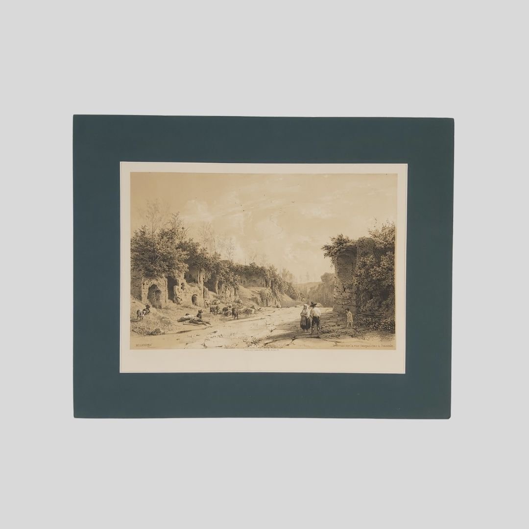 Litografia tinta, stampata su fondo seppia e ritoccata di bianco. Paris, Lemercier, 1852, mm 282×188 (alla battuta), mm 375×289 (foglio). Montata su passepartout mm 400×319. In buone condizioni. Rara. Veduta tratta da: Pittoresk resetour fran Stockholm till Neapel […] 100 vuer teknade efter naturen, lithographierade och uitzifne af C.J. Billmark. Stockholm, J. C. Hedbom, 1852. Il libro Illustra il viaggio di Billmark dalla Svezia all’Italia, attraverso Danimarca, Olanda, Francia, Svizzera, Tirolo, Savoia con magnifiche litografie stampate su fondo seppia e ritoccate di bianco da Billmark, raffiguranti dettagliate vedute di paesaggi e scorci di città. Carl Johann Billmark [Stoccolma 1804-Parigi 1870] Pittore e litografo svedese, fu inizialmente allievo dell’incisore Forsell. Per la sua carriera artistica di paesaggista furono importanti i viaggi nella Contea di Dalarna, San Pietroburgo e Parigi, dove si trasferi e studiò con l’incisore Deroy. Dal 1828 al 1830, mentre era a Parigi, pubblicò 100 studi litografici sul paesaggio. Fu membro dell’Accademia di Stoccolma, nel Museo svedese sono esposte numerose sue vedute della città tra disegni e schizzi. Ricevette la decorazione dell’ordine Wasa.<BR>Tra i suoi lavori di maggior interesse è da annoverare la pubblicazione delle 100 tavole (tra cui questa) contenute nell’opera Pittoresk Resetour fran Stockholm till Neapel stampata a Stoccolma e Parigi nel 1852, che rappresenta il resoconto iconografico del viaggio che parte da Stoccolma e si sofferma lungamente a Napoli e dintorni.