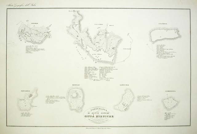 Insieme di 7 piantine di città etrusche: Fiesole, Volterra, Cortona, Populonia, Roselle, Saturnia e Ansedonia, in unico foglio